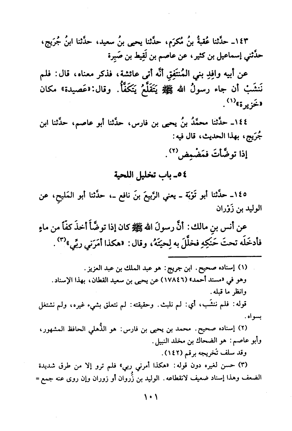 ١٤٣ - حدَّثنا عُقبةُ بنُ مُكرَم، حدَّثنا يحيي بنُ سعيد، حدَّثنا ابنُ جُرَيج، حدَّثني إسماعيل بن كثير، عن عاصم بن لَقِيط بن صَبِرة