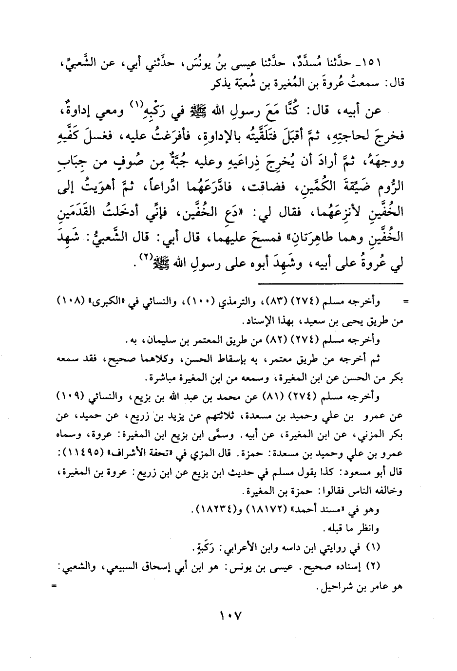 ١٥١ - حدَّثنا مُسدَّدٌ، حدَّثنا عيسى بنُ يونُسَ، حدّثني أبي، عن الشَّعبيِّ، قال: سمعتُ عُروةَ بن المُغيرة بن شُعبَة يذكر
