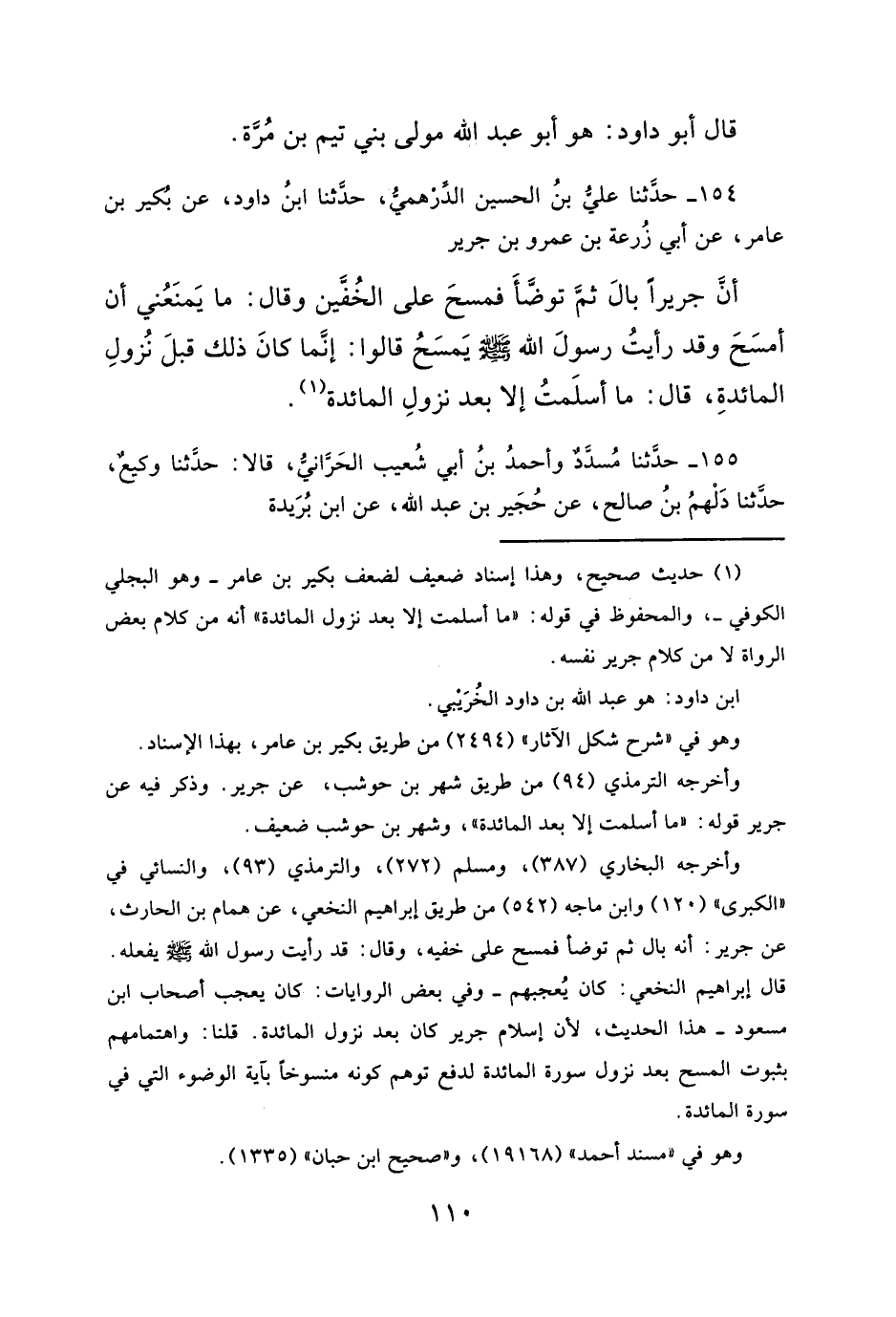 أنَّ جريراً بالَ ثمَّ توضأَ فمسحَ على الخُفَّين وقال: ما يَمنَعُني أن أمسَحَ وقد رأيتُ رسولَ الله - صلى الله عليه وسلم - يَمسَحُ قالوا: إنَّما كانَ ذلك قبلَ نُزولِ المائدةِ، قال: ما أسلَمتُ إلا بعد نزولِ المائدة (¬١).