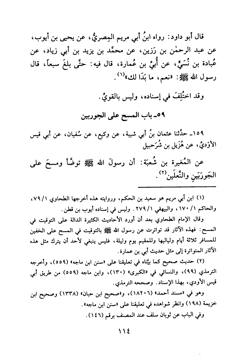 وقال الإمام الطحاوي بعد أن أورد الأحاديث الكثيرة الدالة على التوقيت في المسح: فهذه الآثار قد تواترت عن رسول الله - صلى الله عليه وسلم - بالتوقيت في المسح على الخفين للمسافر ثلاثة أيام ولياليها وللمقيم يوم وليلة، فليس ينبغي لأحد أن يترك مثل هذه الآثار المتواترة إلى مثل حديث أبي بن عمارة.
