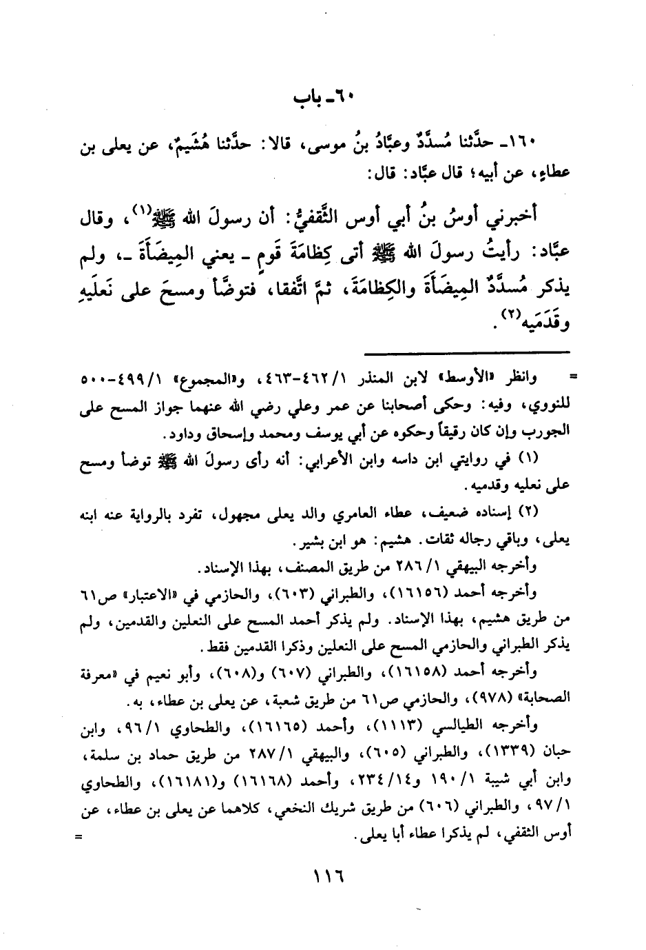(¬١) في روايتي ابن داسه وابن الأعرابي: أنه رأى رسولَ الله - صلى الله عليه وسلم - توضّأ ومسح على نعليه وقدميه.