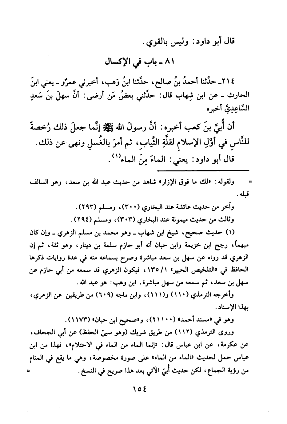 وروى الترمذي (١١٢) من طريق شريك (وهو سيئ الحفظ) عن أبي الجحاف، عن عكرمة، عن ابن عباس قال: "إنما الماء من الماء في الاحتلام"، فهذا من ابن عباس حمل لحديث "الماء من الماء "على صورة مخصوصة، وهي ما يقع في المنام من رؤية الجماع، لكن حديث أُبيّ الآتي بعد هذا صريح في النسخ.=