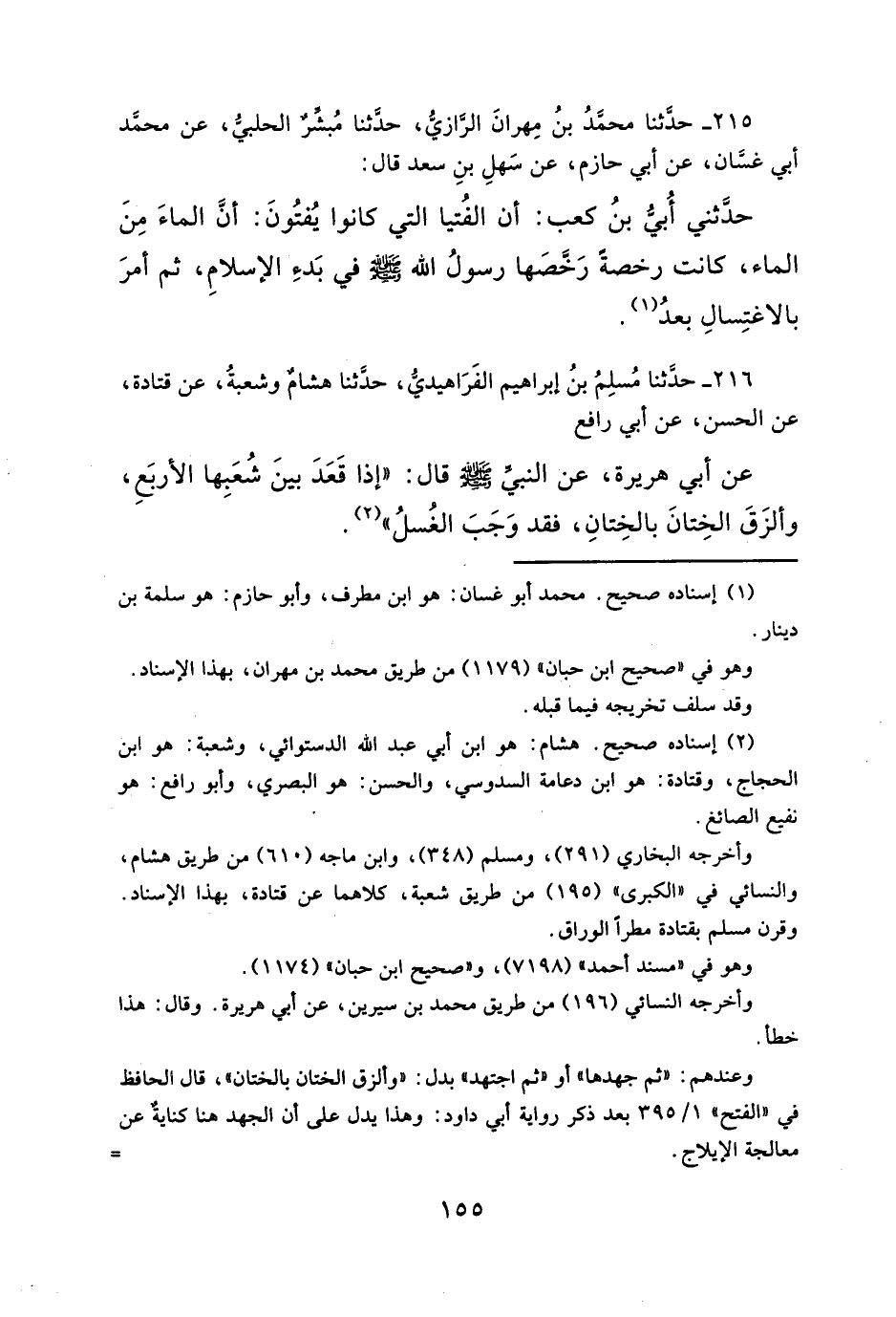 عن أبي هريرة، عن النبيِّ -صلَّى الله عليه وسلم- قال: "إذا قَعَدَ بينَ شُعَبِها الأربَعِ، وألزَقَ الخِتانَ بالخِتانِ، فقد وَجَبَ الغُسلُ" (¬٢).