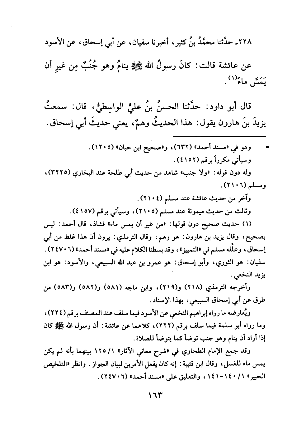 ويُعارضه ما رواه إبراهيم النخعي عن الأسود فيما سلف عند المصنف برقم (٢٢٤)، وما رواه أبو سلمة فيما سلف برقم (٢٢٢)، كلاهما عن عائشة: أن رسول الله - صلى الله عليه وسلم - كان إذا أراد أن ينام وهو جنب توضّأ كما يتوضَّأ للصلاة.
