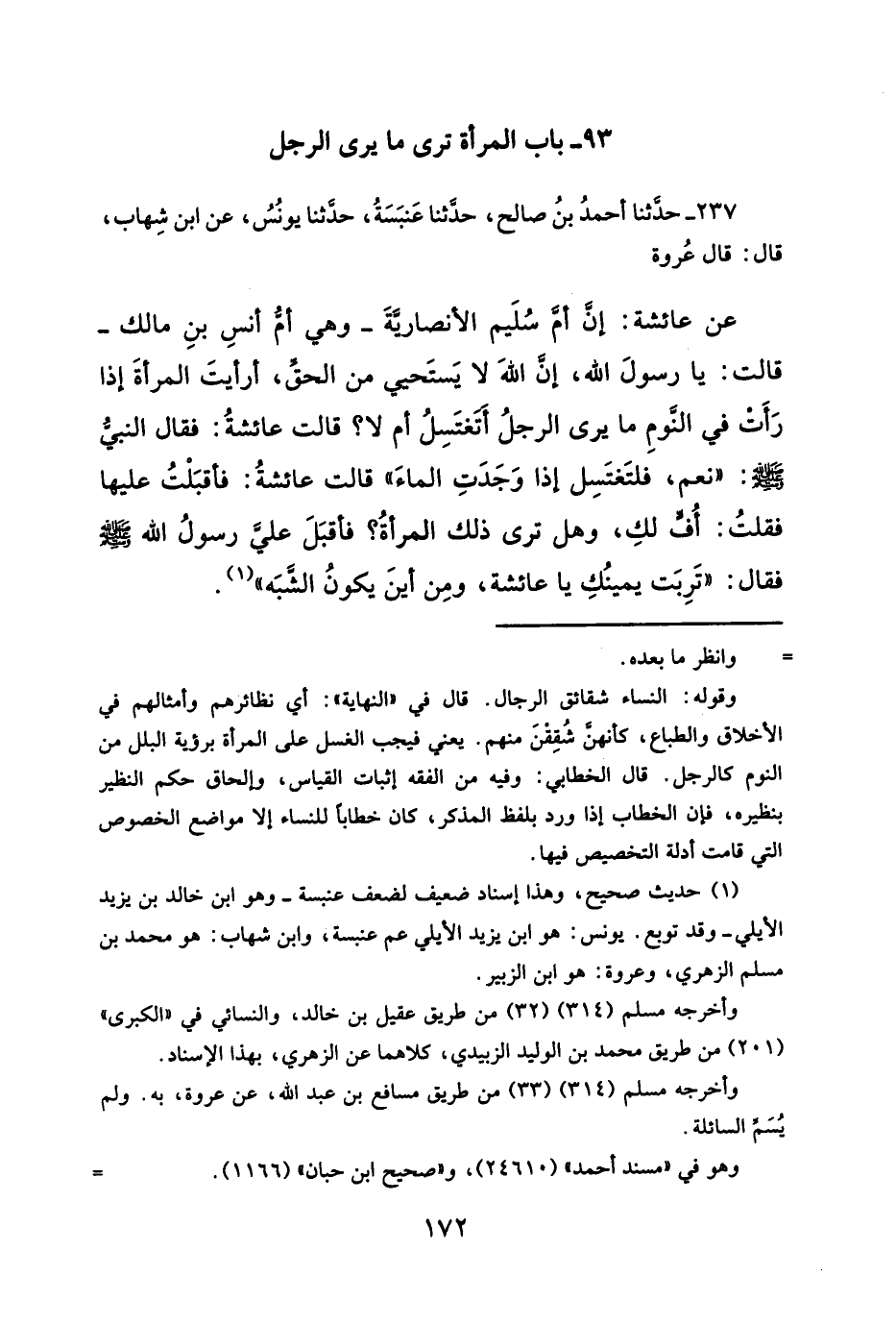 عن عائشة: إنَّ أمَّ سُلَيم الأنصاريَّةَ -وهي أمُّ أنسِ بنِ مالك- قالت: يا رسولَ الله، إنَّ اللهُ لا يَستَحيي من الحقِّ، أرأيتَ المرأةَ إذا رَأَتْ في النَّومِ ما يرى الرجلُ أتغتَسِلُ أم لا؟ قالت عائشةُ: فقال النبيُّ - صلى الله عليه وسلم -: "نعم، فلتَغتَسِل اذا وَجَدَتِ الماءَ" قالت عائشةُ: فأقبَلْتُ عليها فقلتُ: أُفٍّ لكِ، وهل ترى ذلك المرأة؟ فأقبَلَ عليَّ رسولُ الله - صلى الله عليه وسلم - فقال: "تَرِبَت يمينُكِ يا عائشة، ومِن أينَ يكونُ الشَّبَه" (¬١).