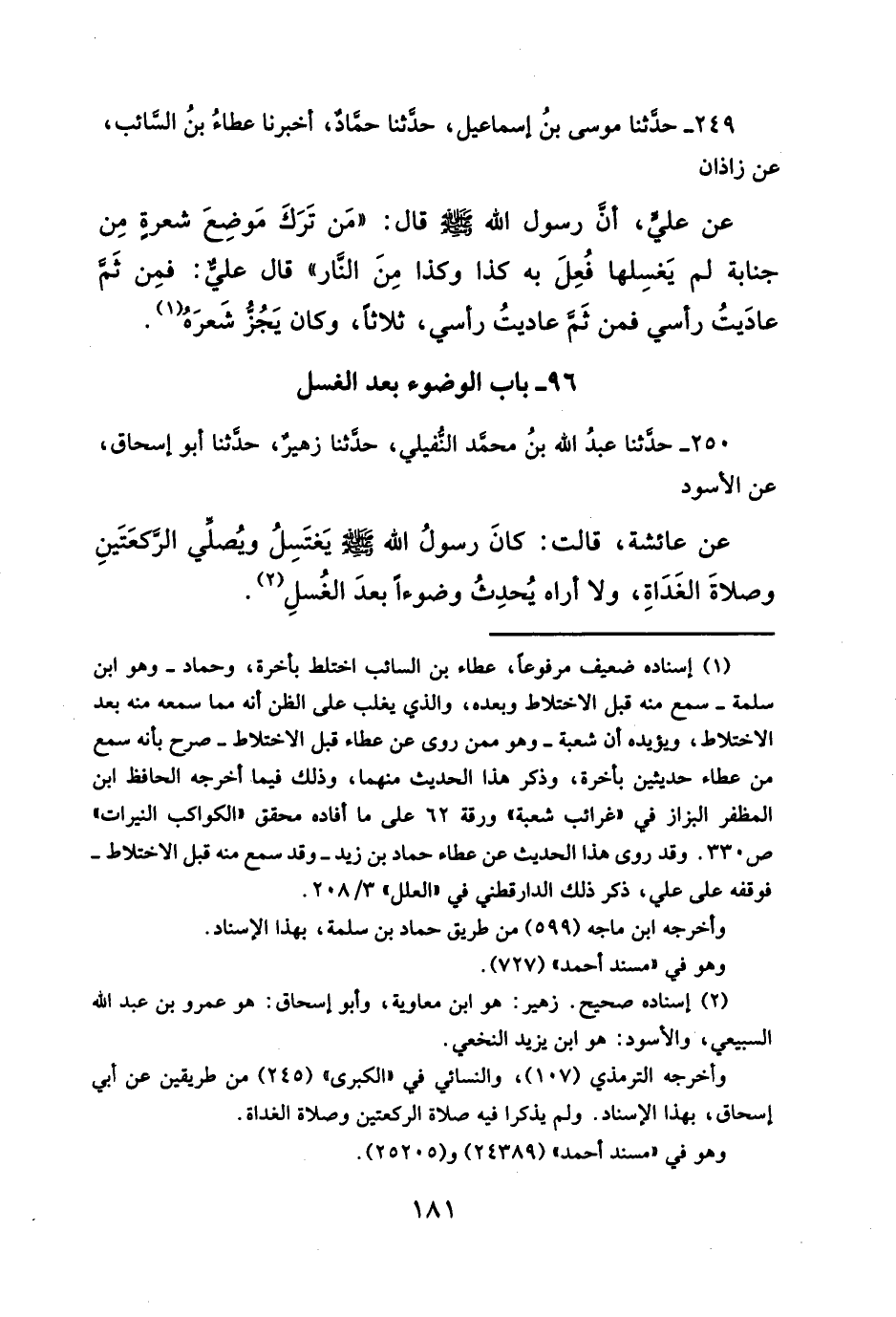 عن عليٍّ، أنَّ رسول الله - صلى الله عليه وسلم - قال: "مَن تَرَكَ مَوضِعَ شعرةٍ مِن جنابة لم يَغسِلها فُعِلَ به كذا وكذا مِنَ النَّار" قال علىٌّ: فمِن ثَمَّ عادَيتُ رأسي فمن ثَمَّ عاديتُ رأسي، ثلاثاً، وكان يَجُزُّ شَعرَهُ (¬١).
