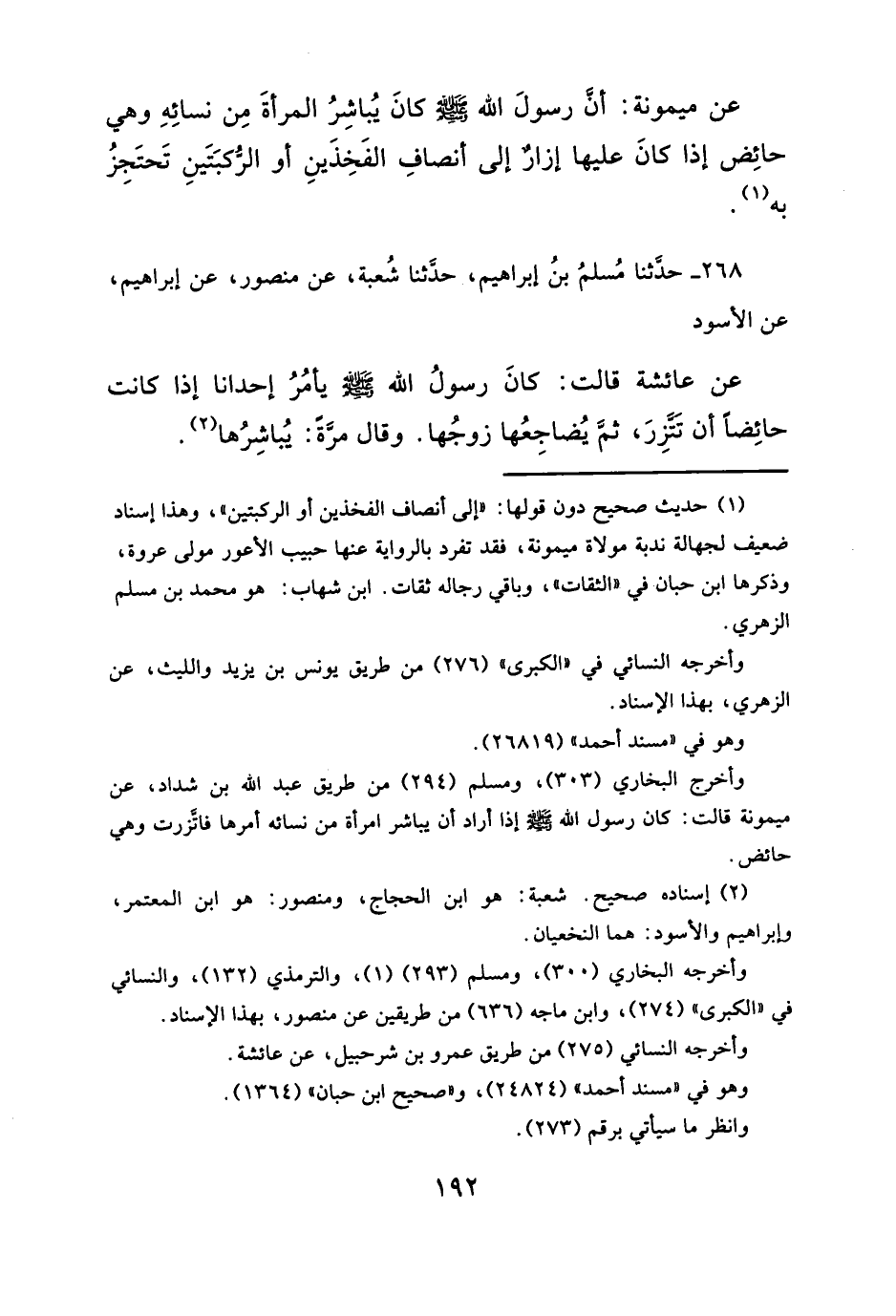 عن عائشة قالت: كانَ رسولُ الله - صلى الله عليه وسلم - يأمُرُ إحدانا إذا كانت حائِضاً أن تَتَّزِرَ، ثمَّ يُضاجِعُها زوجُها. وقال مرَّةً: يُباشِرُها (¬٢).