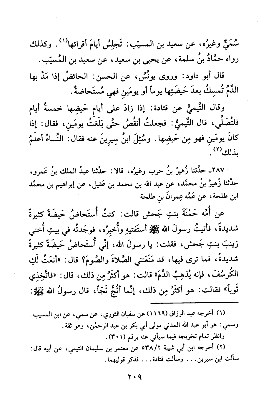 عن أُمِّه حَمْنَةَ بنتِ جَحش قالت: كنتُ أُستَحاضُ حَيضَةً كثيرةً شديدةً، فأتيتُ رسولَ الله - صلى الله عليه وسلم -أستَفتيهِ وأُخبِرُه، فوجَدتُه في بيتِ أُختي زينبَ بنتِ جَحش، فقلت: يا رسولَ الله، إني أُستَحاضُ حَيضَةً كثيرةً شديدةً، فما ترى فيها، قد مَنَعَتني الصَّلاةَ والصَّومَ؟ قال: "أنعَتُ لَكِ الكُرسُفَ، فإنه يُذهِبُ الدمَ" قالت: هو أكثَرُ مِن ذلك، قال: "فاتَّخِذِي ثَوباً" فقالت: هو أكثَرُ مِن ذلك، إنَّما أثُجُّ ثَجّاً، قال رسولُ الله - صلى الله عليه وسلم -: