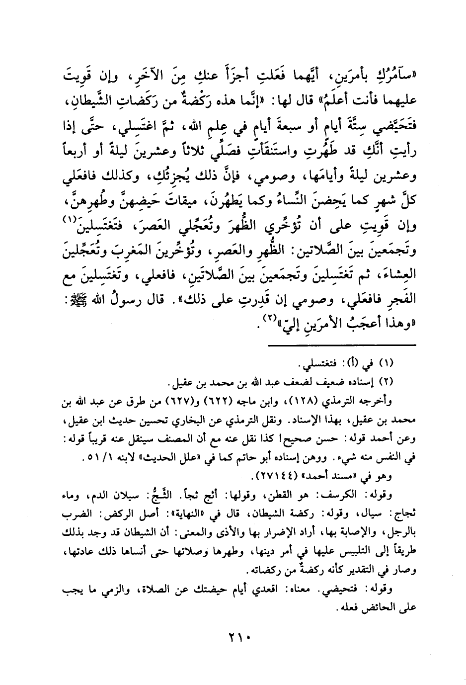 "سآمُرُكِ بأمرَينِ، أيهما فَعَلتِ أجزَأَ عنكِ مِنَ الآخَرِ، وإن قَوِيتَ عليهما فأنت أعلَمُ" قال لها: "إنَّما هذه رَكْضةٌ من رَكَضاتِ الشَّيطانِ، فتَحَيَّضي سِتَّةَ أيامٍ أو سبعةَ أيامٍ في عِلمِ الله، ثمَّ اغتَسِلي، حتَّى إذا رأيتِ أنَّكِ قد طَهُرتِ واستَنقَأتِ فصَلِّي ثلاثاً وعشرينَ ليلةً أو أربعاً وعشرين ليلةً وأيامَها، وصومي، فإنَّ ذلك يُجزِئُكِ، وكذلك فافعَلي كلَّ شهرٍ كما يَحِضنَ النِّساءُ وكما يَطهُرنَ، ميقاتَ حَيضِهنَّ وطُهرِهنَّ، وإن قَوِيتِ على أن تُؤخِّري الظُّهرَ وتُعَجَّلي العَصرَ، فتَغتَسِلينَ (¬١) وتَجمَعينَ بينَ الصَّلاتين: الظُّهرِ والعَصرِ، وتُؤخِّرينَ المَغرِبَ وتُعَجِّلينَ العِشاءَ، ثمَّ تَغتَسِلينَ وتَجمَعينَ بينَ الصلاتَينِ، فافعلي، وتَغتَسِلينَ مع الفَجرِ فافعَلي، وصومي إن قَدِرتِ على ذلك". قال رسولُ الله - صلى الله عليه وسلم -: "وهذا أعجَبُ الأمرَينِ إليّ" (¬٢).