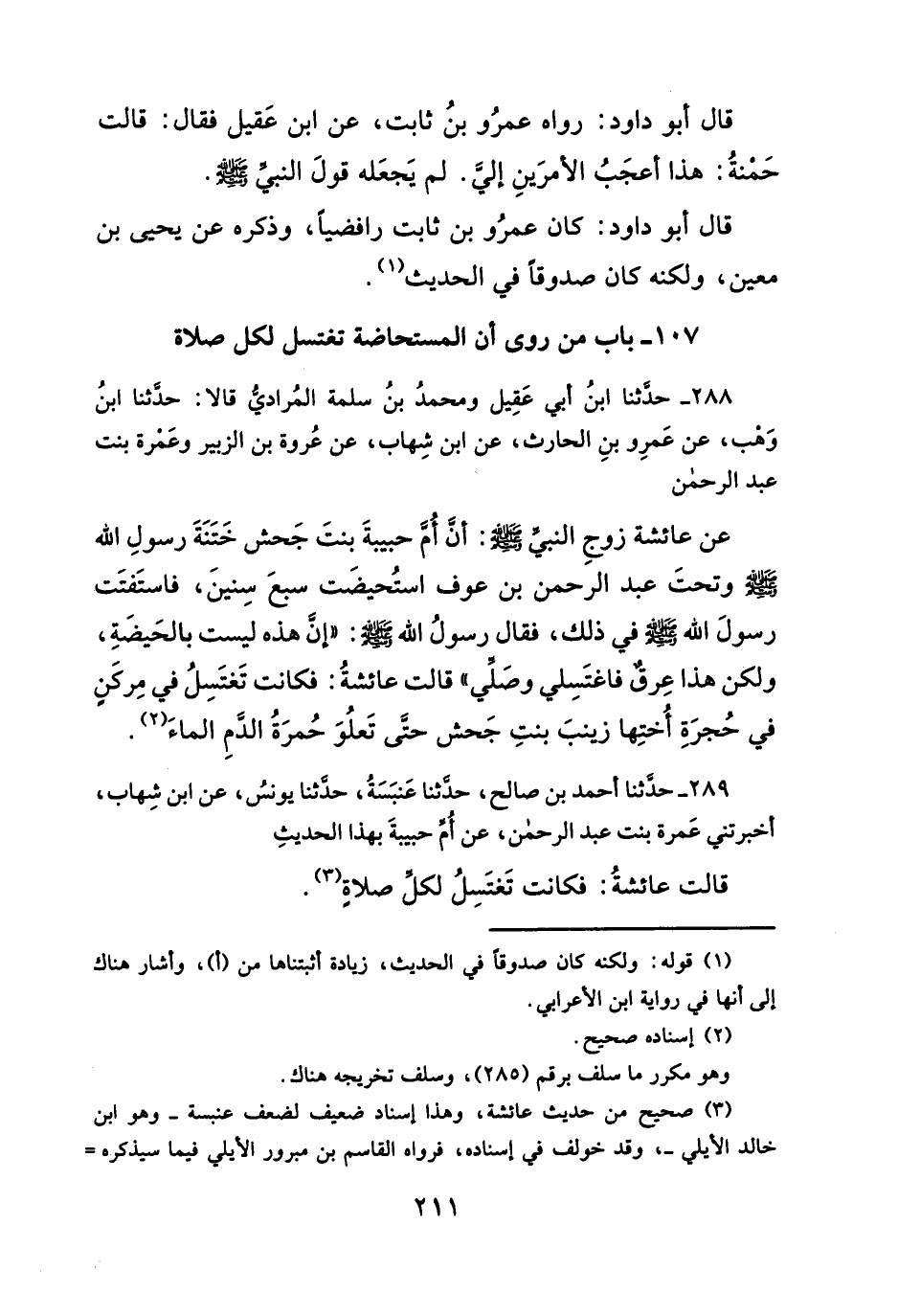 ٢٨٩ - حدَّثنا أحمد بن صالح، حدَّثنا عَنبَسَةُ، حدَّثنا يونسُ، عن ابن شِهاب، أخبرتني عَمرة بنت عبد الرحمن، عن أُمِّ حبيبةَ بهذا الحديثِ