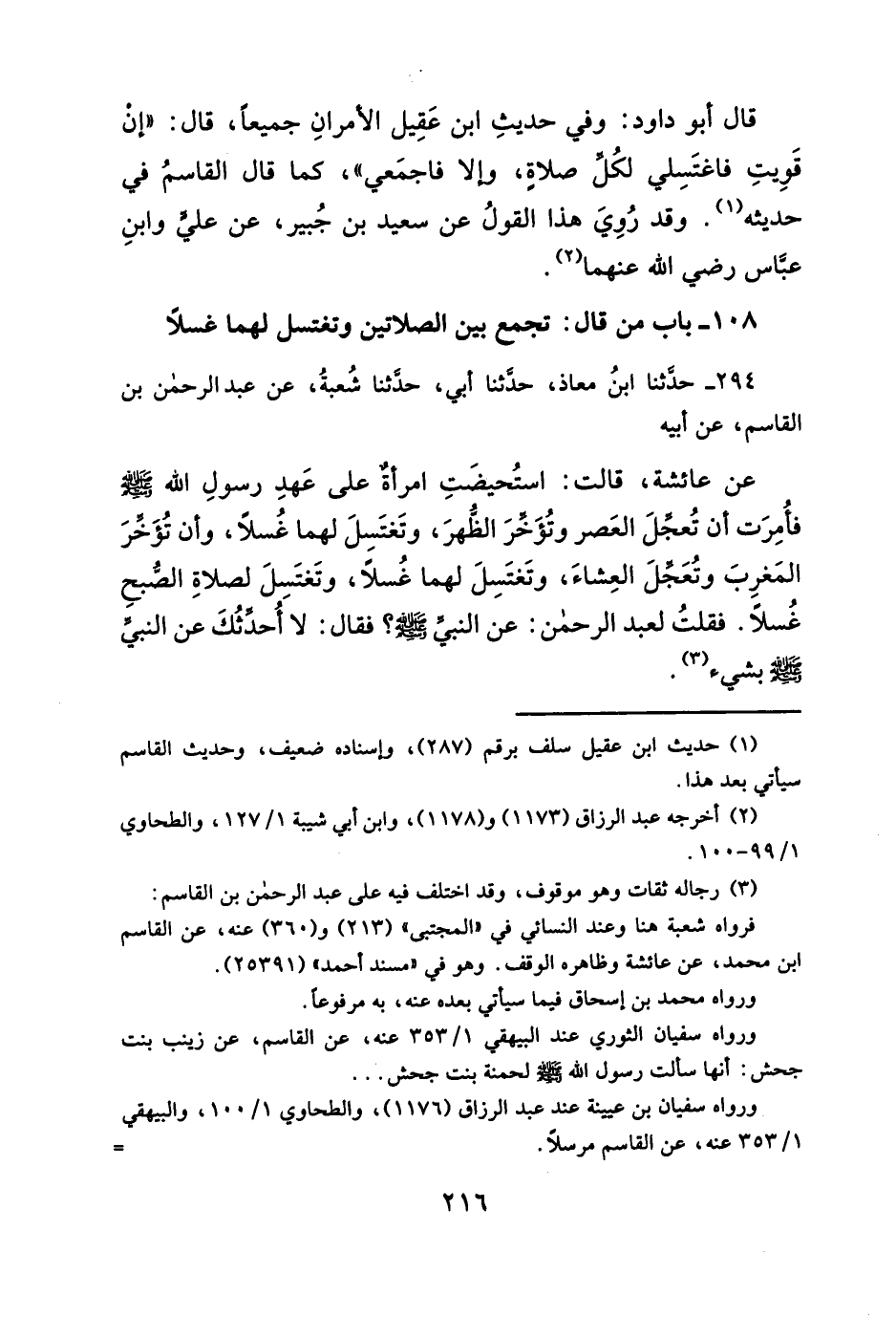 عن عائشة، قالت: استُحيضَتِ امرأة على عَهدِ رسولِ الله- صلى الله عليه وسلم - فأُمِرَت أن تُعجِّلَ العَصر وتُؤَخِّرَ الظُّهرَ، وتَغتَسِلَ لهما غُسلاً، وأن تُؤَخِّرَ المَغرِبَ وتُعَجِّلَ العِشاء, وتَغتَسِلَ لهما غُسلاً، وتَغتَسِلَ لصلاةِ الصُّبحِ غُسلاً. فقلتُ لعبد الرحمن: عن النبيِّ - صلى الله عليه وسلم -؟ فقال: لا أُحدثُكَ عن النبيِّ - صلى الله عليه وسلم - بشيء (¬٣).