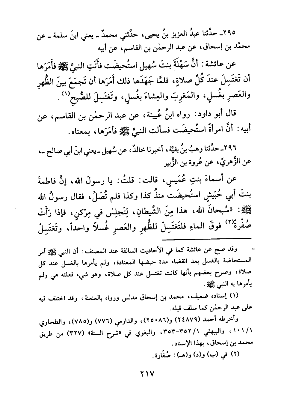 قال أبو داود: رواه ابنُ عُيينة، عن عبد الرحمن بن القاسم، عن أبيه: أنَّ امرأةً استُحيضَت فسألت النبيَّ - صلى الله عليه وسلم -فأمَرَها، بمعناه.