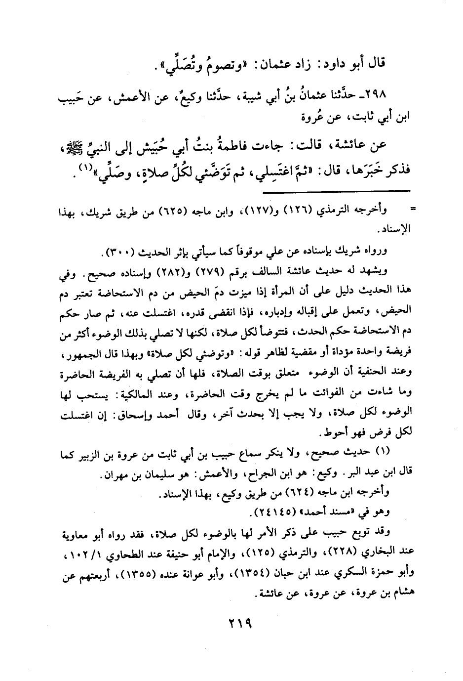 وقد توبع حبيب على ذكر الأمر لها بالوضوء لكل صلاة، فقد رواه أبو معاوية عند البخاري (٢٢٨)، والترمذي (١٢٥)، والإمام أبو حنيفة عند الطحاوي ١/ ١٠٢، وأبو حمزة السكري عند ابن حبان (١٣٥٤)، وأبو عوانة عنده (١٣٥٥)، أربعتهم عن هشام بن عروة، عن عروة، عن عائشة.