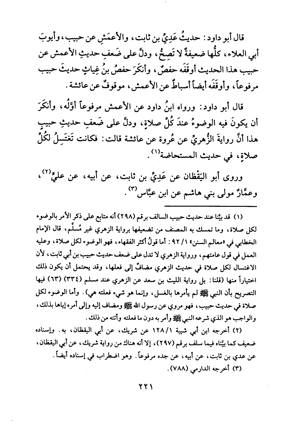 قال أبو داود: ورواه ابنُ داود عن الأعمش مرفوعاً أوَّلُه، وأنكَرَ أن يكونَ فيه الوضوءُ عندَ كُلِّ صلاةِ، ودلَّ على ضَعفِ حديثِ حبيبٍ هذا أنَّ روايةَ الزهريّ عن عُروة عن عائشة قالت: فكانت تَغتَسِلُ لكُلِّ صلاةٍ، في حديث المستحاضة (¬١).
