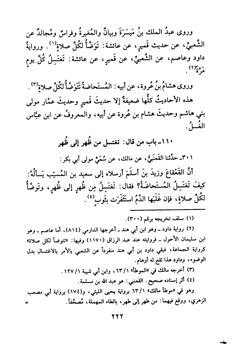 (¬٢) رواية داود -وهو ابن أبي هند- أخرجها الدارمى (٨١٤)، أما عاصم -وهو ابن سليمان الأحول- فروايته عند عبد الرزاق (١١٧٠) وفيها: "تتوضأ لكل صلاة" كرواية الجماعة، فبقي داود بن أبي هند منفرداً عن الشعبي بالأمر بالاغتسال بدل الوضوء، وداود هذا تقع له أوهام.