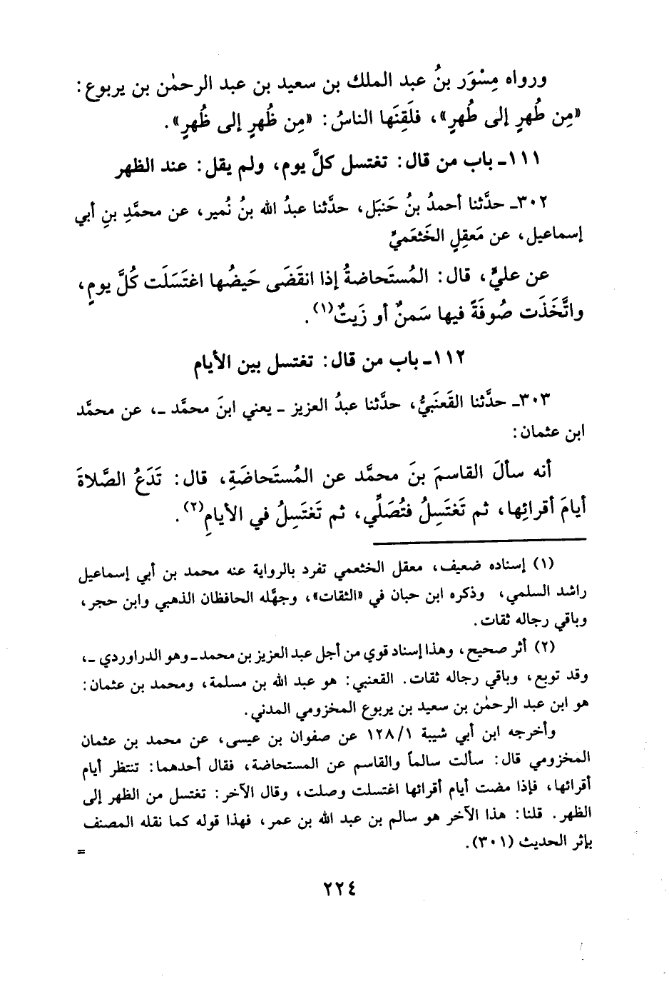 وأخرجه ابن أبي شيبة ١٢٨/ ١ عن صفوان بن عيسى، عن محمَّد بن عثمان المخزومي قال: سألت سالماً والقاسم عن المستحاضة، فقال أحدهما: تنتظر أيام أقرائها، فإذا مضت أيام أقرائها اغتسلت وصلت، وقال الآخر: تغتسل من الظهر إلى الظهر. قلنا: هذا الآخر هو سالم بن عبد الله بن عمر، فهذا قوله كما نقله المصنف بإثر الحديث (٣٠١).=