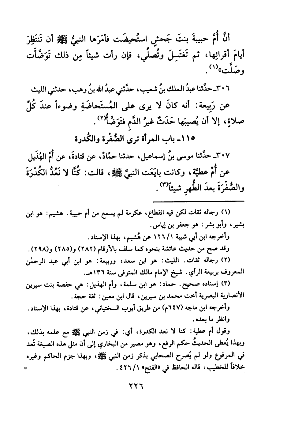 ٣٠٧ - حدَّثنا موسى بنُ إسماعيل، حدَّثنا حمَّادٌ، عن قتادةَ، عن أُمِّ الهُذَيل عن أُمِّ عطية، وكانت بايَعَت النبيَّ - صلى الله عليه وسلم -، قالت: كُنَّا لا نَعُدّ الكُدرَةَ والصُّفْرَةَ بعدَ الطُّهرِ شيئاً (¬٣).