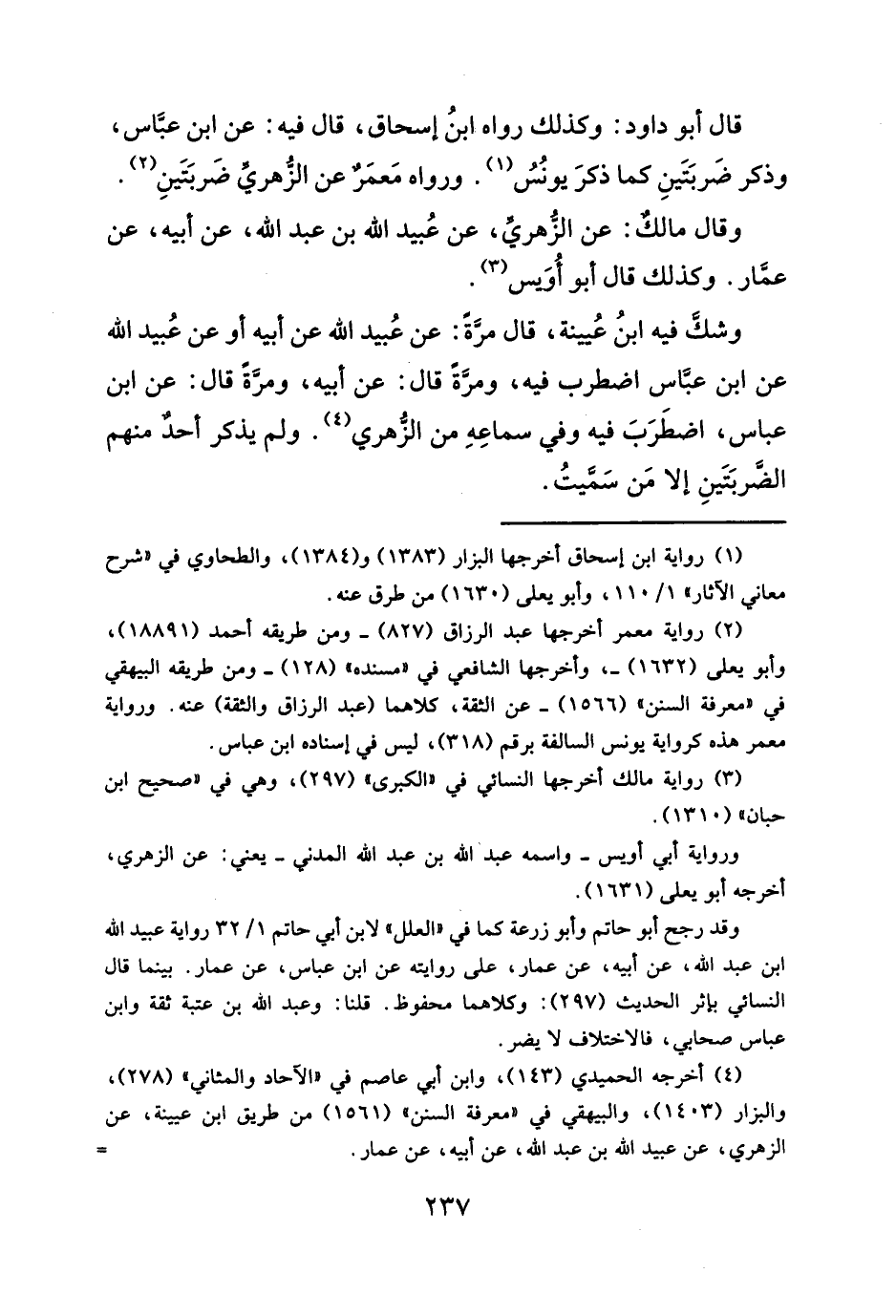 قال أبو داود: وكذلك رواه ابنُ إسحاق، قال فيه: عن ابن عبَّاس، وذكر ضَربَتَينِ كما ذكرَ يونُسُ (¬١). ورواه مَعمَر عن الزُّهريّ ضَربَتَينِ (¬٢).