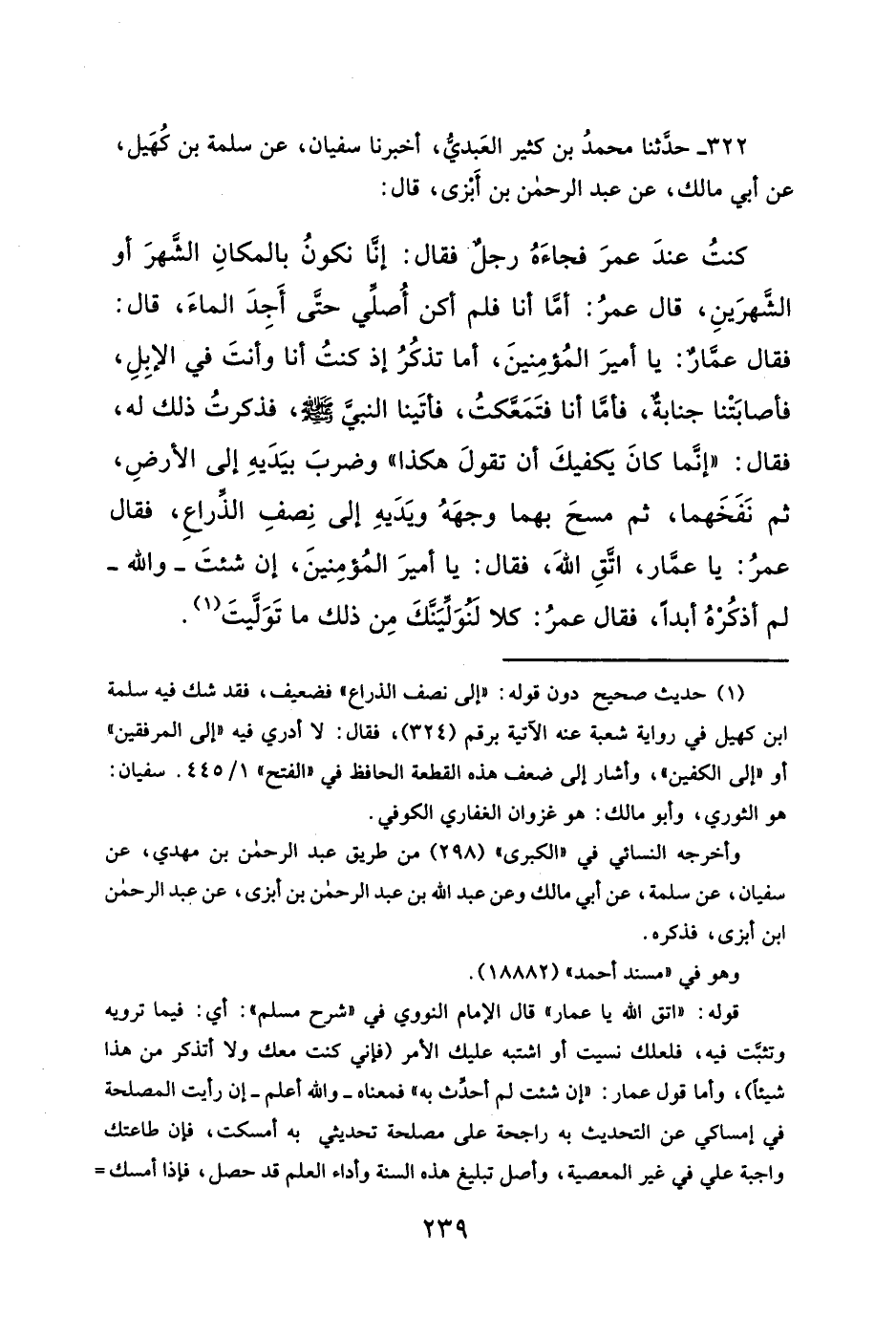 ٣٢٢ - حدَّثنا محمَّدُ بن كثير العَبديُّ، أخبرنا سفيان، عن سلمة بن كُهَيل، عن أبي مالك، عن عبد الرحمن بن أَبْزى، قال: