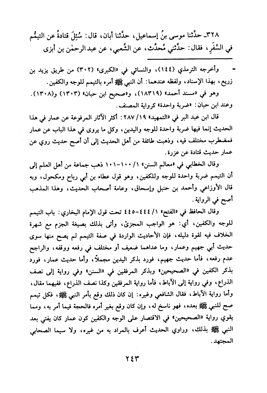 ٣٢٨ - حدَّثنا موسى بنُ إسماعيل، حدَّثنا أبان، قال: سُئِلَ قتادةُ عن التيمُّم في السَّفَرِ، فقال: حدَّثني مُحدِّث، عن الشَعبي، عن عبد الرحمن بن أبزى