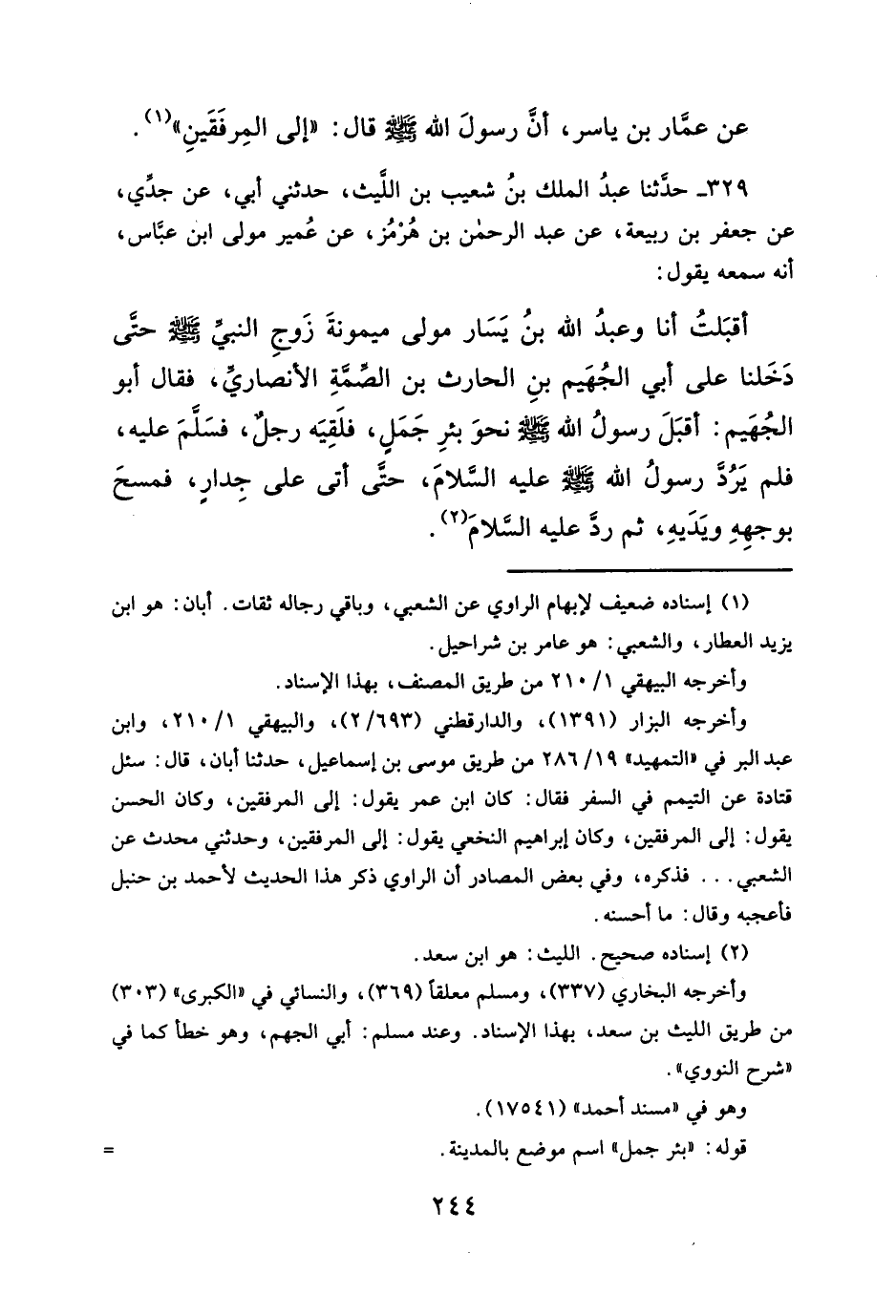 ٣٢٩ - حدَّثنا عبدُ الملك بنُ شعيب بن الليث، حدَّثني أبي، عن جدِّي، عن جعفر بن ربيعة، عن عبد الرحمن بن هُرْمُز، عن عمير مولى ابن عبَّاس، أنه سمعه يقول: أقبَلتُ أنا وعبدُ الله بنُ يَسَار مولى ميمونةَ زَوجِ النبيِّ - صلى الله عليه وسلم - حتَّى دَخَلنا على أبي الجُهَيم بنِ الحارث بن الصمةِ الأنصاري، فقال أبو الجُهَيم: أقبَلَ رسولُ الله - صلى الله عليه وسلم - نحوَ بئرِ جَمَلٍ، فلَقِيَه رجلٌ، فسَلَّمَ عليه، فلم يَرُدَّ رسولُ الله - صلى الله عليه وسلم - عليه السلامَ، حتَّى أتى على جِدارٍ، فمسحَ بوجهِهِ ويَدَيهِ، ثمَّ ردَّ عليه السَّلامَ (¬٢).