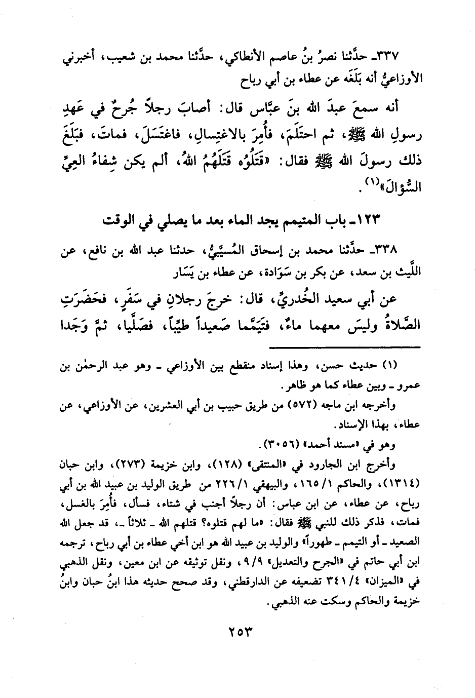 وأخرج ابن الجارود في "المنتقى" (١٢٨)، وابن خزيمة (٢٧٣)، وابن حبان (١٣١٤)، والحاكم ١/ ١٦٥، والبيهقي ١/ ٢٢٦ من طريق الوليد بن عبيد الله بن أبي رباح، عن عطاء، عن ابن عباس: أن رجلاً أجنب في شتاء، فسأل، فأُمِرَ بالغسل، فمات، فذكر ذلك للنبي - صلى الله عليه وسلم -فقال: "ما لهم قتلوه؟ قتلهم الله -ثلاثاً-، قد جعل الله الصعيد -أو التيمم- طهوراً" والوليد بن عبيد الله هو ابن أخي عطاء بن أبي رباح، ترجمه ابن أبي حاتم في "الجرح والتعديل" ٩/ ٩، ونقل توثيقه عن ابن معين، ونقل الذهبي في "الميزان" ٤/ ٣٤١ تضعيفه عن الدارقطني، وقد صحح حديثه هذا ابنُ حبان وابنُ خزيمة والحاكم وسكت عنه الذهبي.