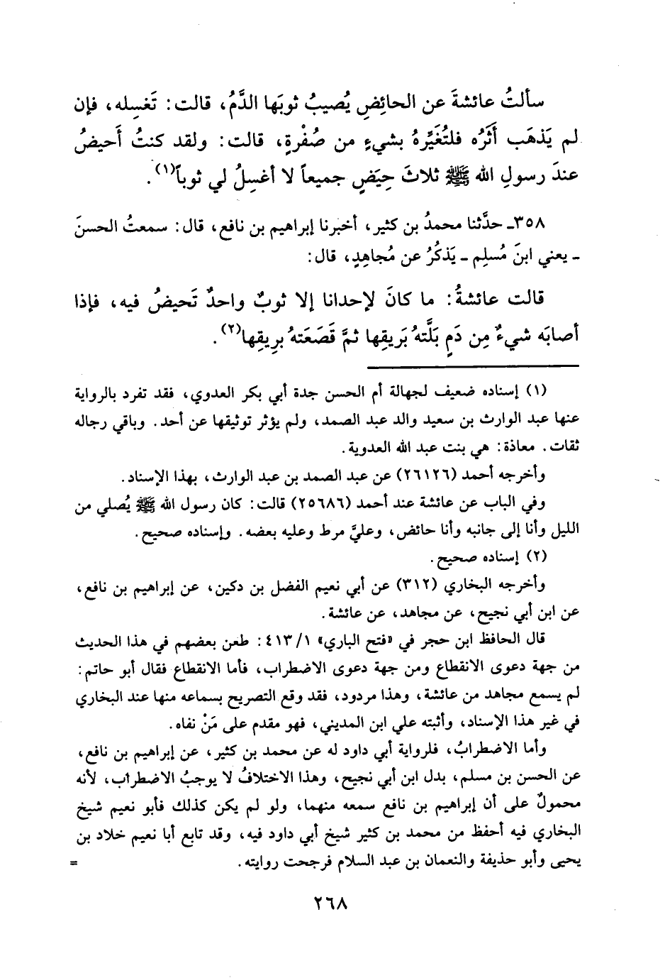قال الحافظ ابن حجر في "فتح الباري" ٤١٣/ ١: طعن بعضهم في هذا الحديث من جهة دعوى الانقطاع ومن جهة دعوى الاضطراب، فأما الانقطاع فقال أبو حاتم: لم يسمع مجاهد من عائشة، وهذا مردود، فقد وقع التصريح بسماعه منها عند البخاري في غير هذا الإسناد، وأثبته علي ابن المديني، فهو مقدم على مَنْ نفاه.