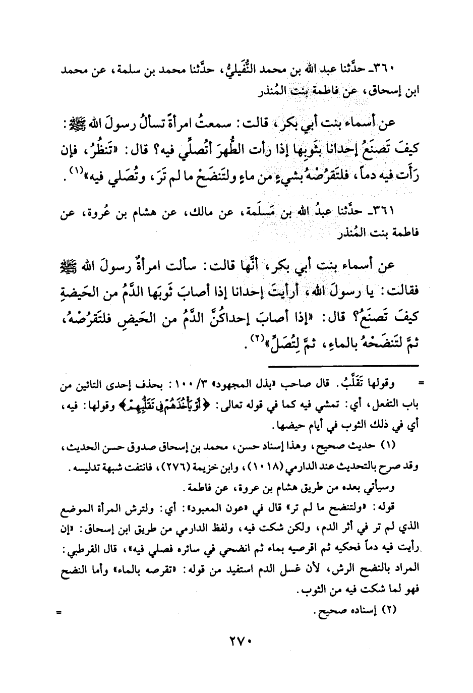 ٣٦٠ - حدَّثنا عبد الله بن محمَّد النُّفَيلي، حدَّثنا محمَّد بن سلمة، عن محمَّد ابن إسحاق، عن فاطمه بنت المُنذر