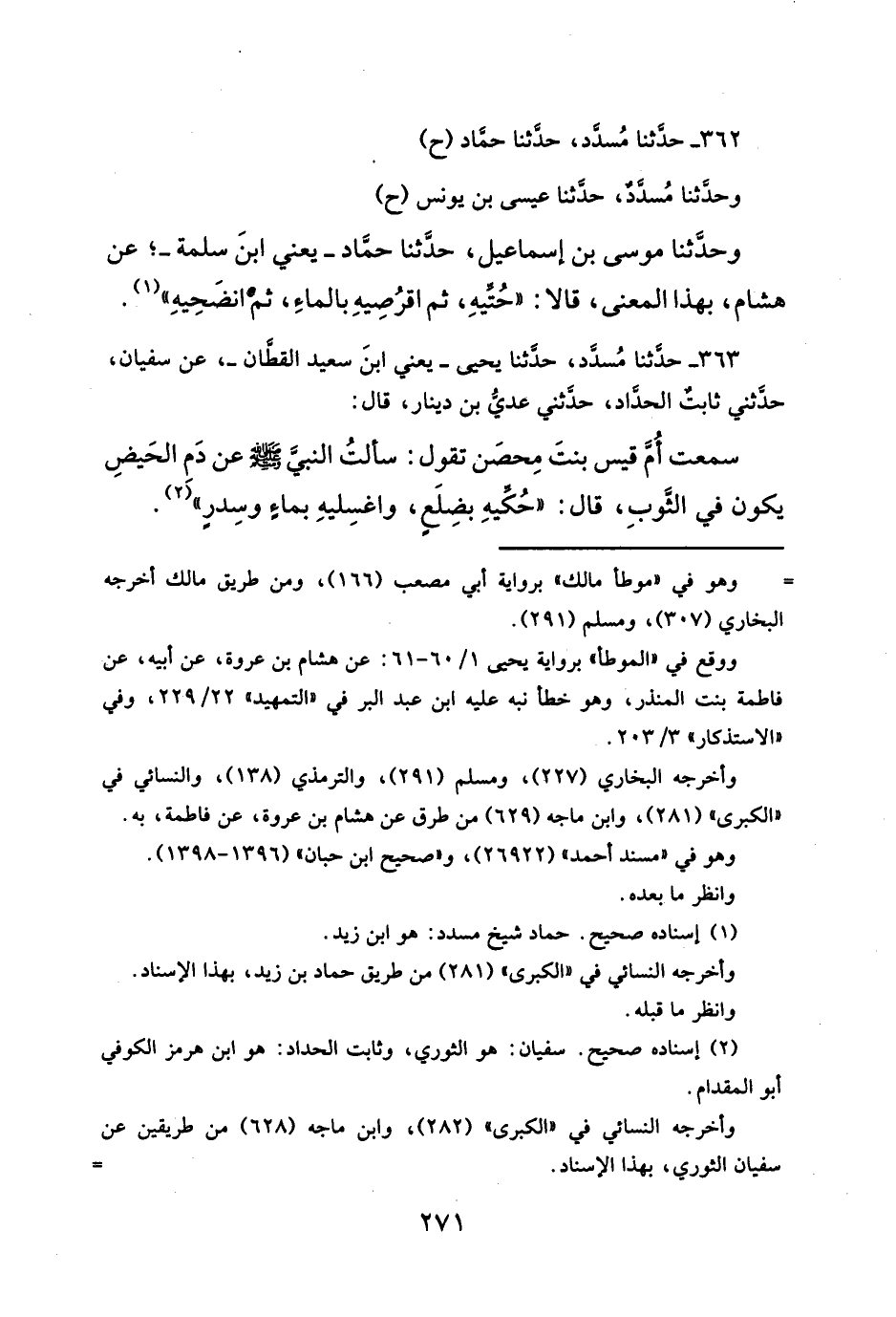وحدَّثنا موسى بن إسماعيل، حدَّثنا حمَّاد -يعني ابنَ سلمة-؛ عن هشام، بهذا المعنى، قالا: "حُتِّيهِ، ثمَّ اقرُصِيهِ بالماء، ثمَّ انضَحِيهِ" (¬١).