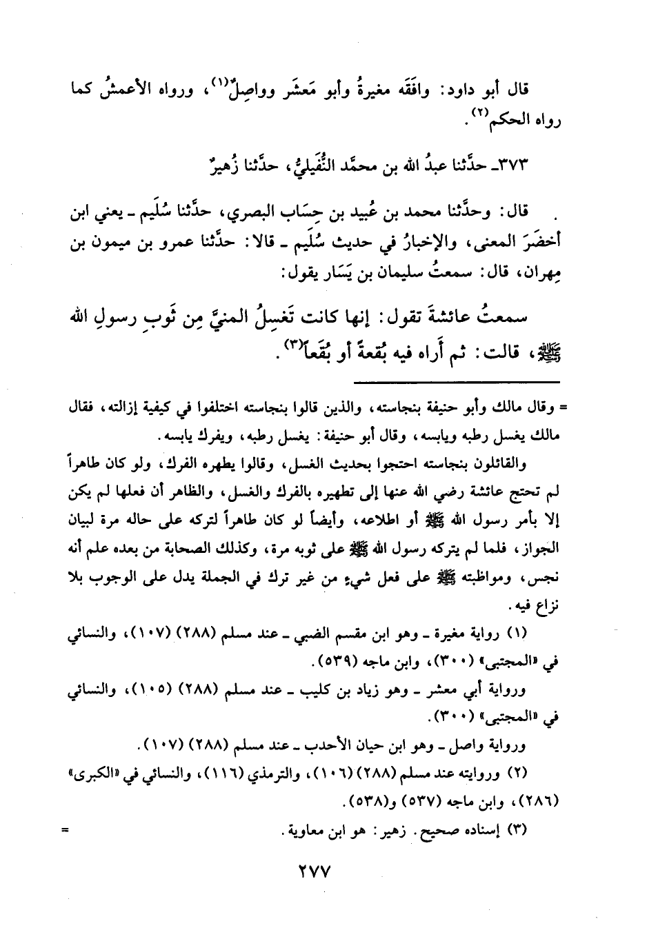 سمعتُ عاثشةَ تقول: إنها كانت تَغسِلُ المنيَّ مِن ثَوبِ رسولِ الله - صلى الله عليه وسلم - قالت: ثمَّ أَراه فيه بقعةً أو بقعاً (¬٣).