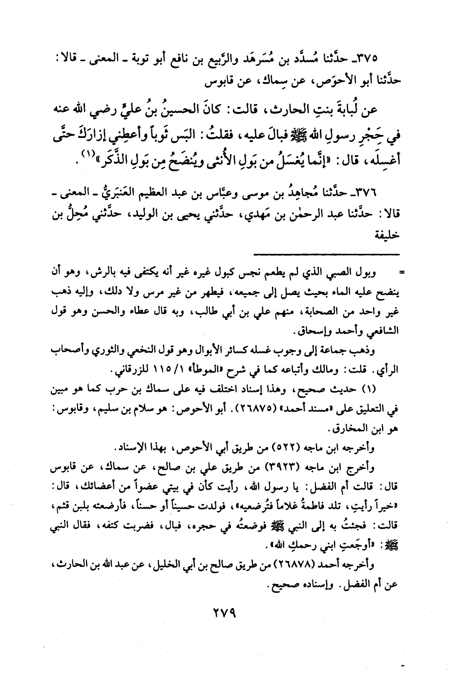 عن لُبابةَ بنتِ الحارث، قالت: كانَ الحسينُ بنُ عليّ رضي الله عنه في حِجْرِ رسولِ الله - صلى الله عليه وسلم - فبالَ عليه، فقلتُ: البَس ثَوباً وأعطِني إزارَكَ حتَّى أغسِلَه، قال: "إنما يُغسَلُ من بَولِ الأُنثى ويُنضَحُ مِن بَولِ الذّكَر" (¬١).