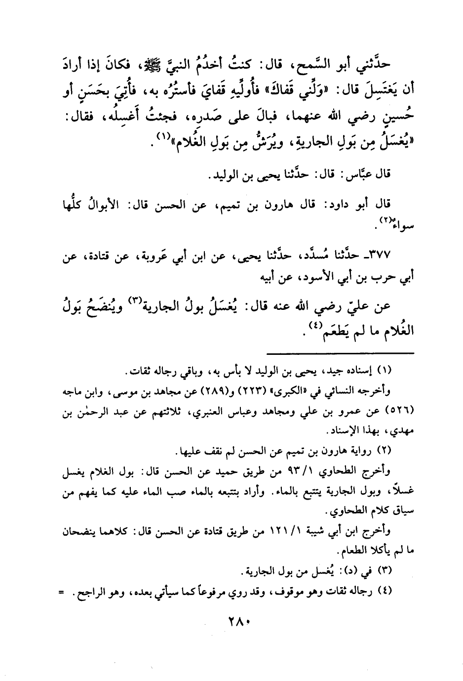 حدّثني أبو السَّمح، قال: كنتُ أخدُمُ النبيَّ - صلى الله عليه وسلم -، فكانَ إذا أرادَ أن يَغتَسِلَ قال: "وَلِّني قَفاكَ" فاُولِّيهِ قَفايَ فأستُرُه به، فأُتِيَ بحَسَنٍ أو حُسينِ رضي الله عنهما، فبالَ على صَدرِه، فجئتُ أَغسِلُه، فقال: "يُغسَلُ مِن بَولِ الجاريةِ، ويُرَشُّ مِن بَولِ الغُلام" (¬١).