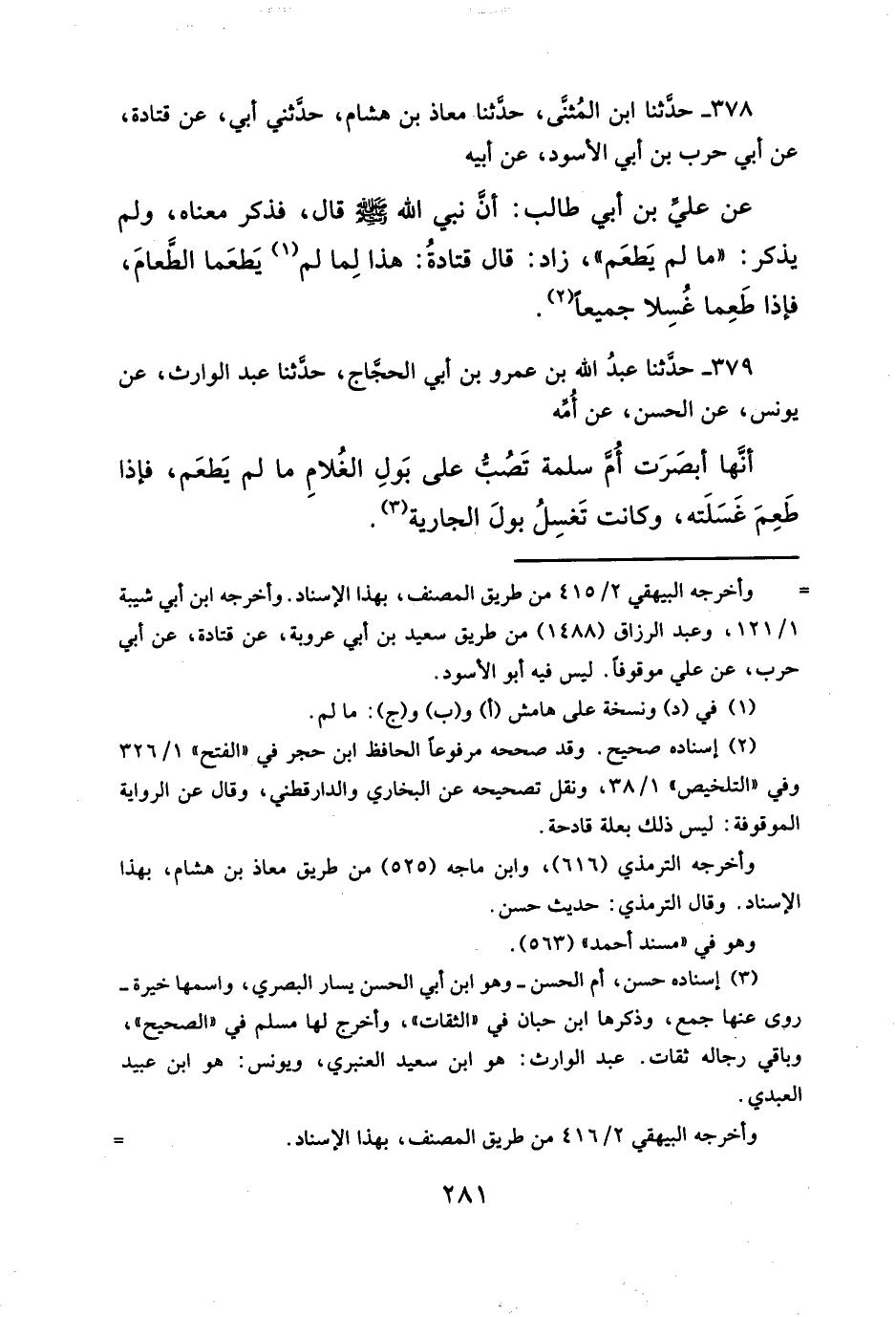 عن علىّ بن أبي طالب: أنَّ نبي الله - صلى الله عليه وسلم - قال، فذكر معناه، ولم يذكر: "ما لم يَطعَم"، زاد: قال قتادةُ: هذا لِما لم (¬١) يَطعَما الطَّعامَ، فإذا طَعِما غُسِلا جميعاً (¬٢).
