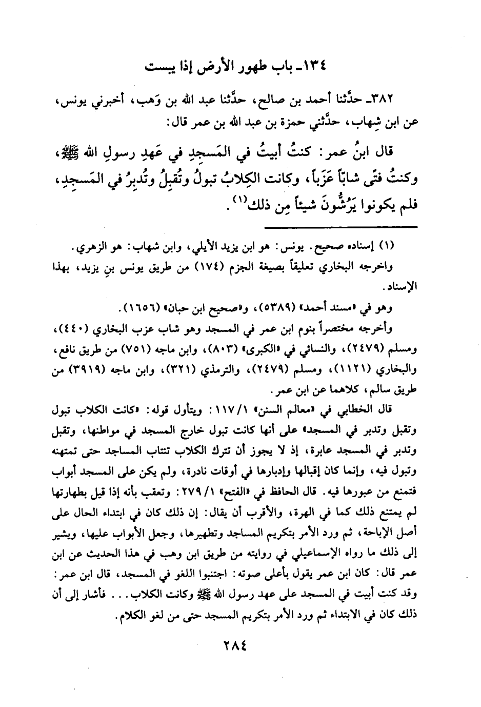 قال ابن عمر: كنتُ أبيتُ في المَسجِدِ في عَهدِ رسولِ الله - صلى الله عليه وسلم -، وكنتُ فتًى شاباً عَزَباً، وكانت الكِلابُ تبولُ وتُقبِلُ وتُدبِرُ في المَسجِدِ، فلم يكونوا يَرشُّونَ شيئاً مِن ذلك (¬١).