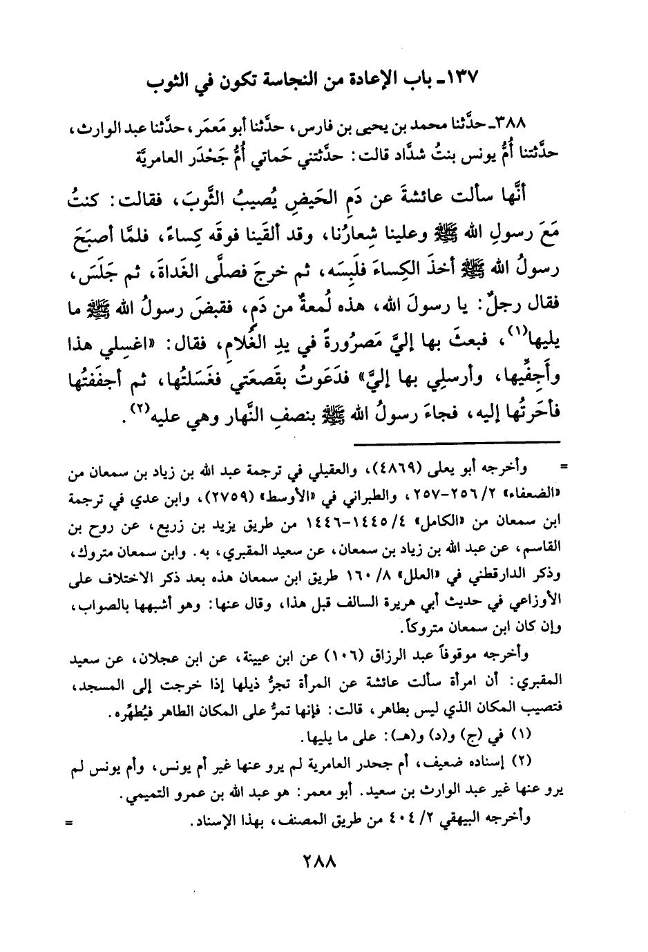 أنَّها سألت عائشةَ عن دَمِ الحَيضِ يُصيبُ الثَّوبَ، فقالت: كنتُ مَعَ رسولِ الله - صلى الله عليه وسلم - وعلينا شِعارُنا، وقد ألقَينا فوقَه كِساءً، فلمّا أصبَحَ رسولُ الله- صلى الله عليه وسلم - أخذَ الكِساءَ فلَبِسَه، ثمَّ خرجَ فصلَّى الغَداةَ، ثمَّ جَلَسَ، فقال رجل: يا رسولَ الله، هذه لُمعةٌ من دَم، فقبضَ رسولُ الله - صلى الله عليه وسلم - ما يليها (¬١)، فبعثَ بها إليَّ مَصرُورةَ في يدِ الغُلامِ، فقال: "اغسِلي هذا وأَجِفِّيها، وأرسلِي بها إليَّ" فدَعَوتُ بقَصعَتي فغَسَلتُها، ثمَّ أجفَفتُها فأحَرتُها إليه، فجاءَ رسولُ الله- صلى الله عليه وسلم - بنصفِ النّهار وهي عليه (¬٢).
