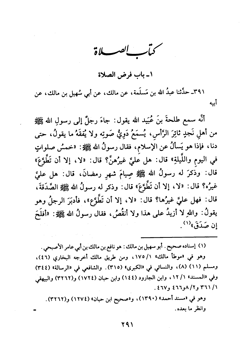 أنَّه سمع طلحةَ بنَ عُبَيد الله يقول: جاءَ رجلٌ إلى رسولِ الله - صلى الله عليه وسلم - من أهلِ نَجدٍ ثائِرَ الرّأسِ، يُسمَعُ دَوِيُّ صَوته ولا يفقَهُ ما يقولُ، حتَّى دنا، فإذا هو يَسألُ عن الإسلامِ، فقال رسولُ الله -صلى الله عليه وسلم - "خمسُ صلواتٍ في اليومِ والليلة" قال: هل عليَّ غيرُهنَّ؟ قال: "لا، إلا أن تَطَّوَّعَ" قال: وذكرَ له رسولُ الله - صلى الله عليه وسلم - صِيامَ شهرِ رمضانَ، قال: هل عليَّ غيرُه؟ قال: "لا، إلا أن تَطَّوَّعَ" قال: وذكر له رسولُ الله - صلى الله عليه وسلم - الصَّدَقةَ، قال: فهل عليَّ غيرُها؟ قال: "لا، إلا أن تَطَّوَّع"، فأدبَرَ الرجلُ وهو يقولُ: واللهِ لا أزيدُ على هذا ولا أنقُصُ، فقال رسولُ الله - صلى الله عليه وسلم -: "أفلَحَ إن صَدَقَ" (¬١).