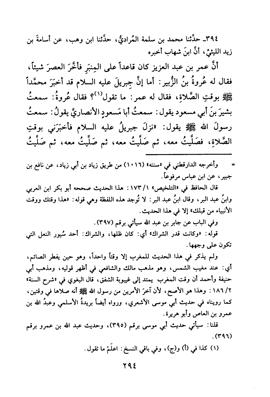 ٣٩٤ - حدَّثنا محمَّد بن سلمة المُراديُّ، حدَّثنا ابن وهب، عن أسامةَ بن زيد اللّيثيّ، أنّ ابنَ شهاب أخبره