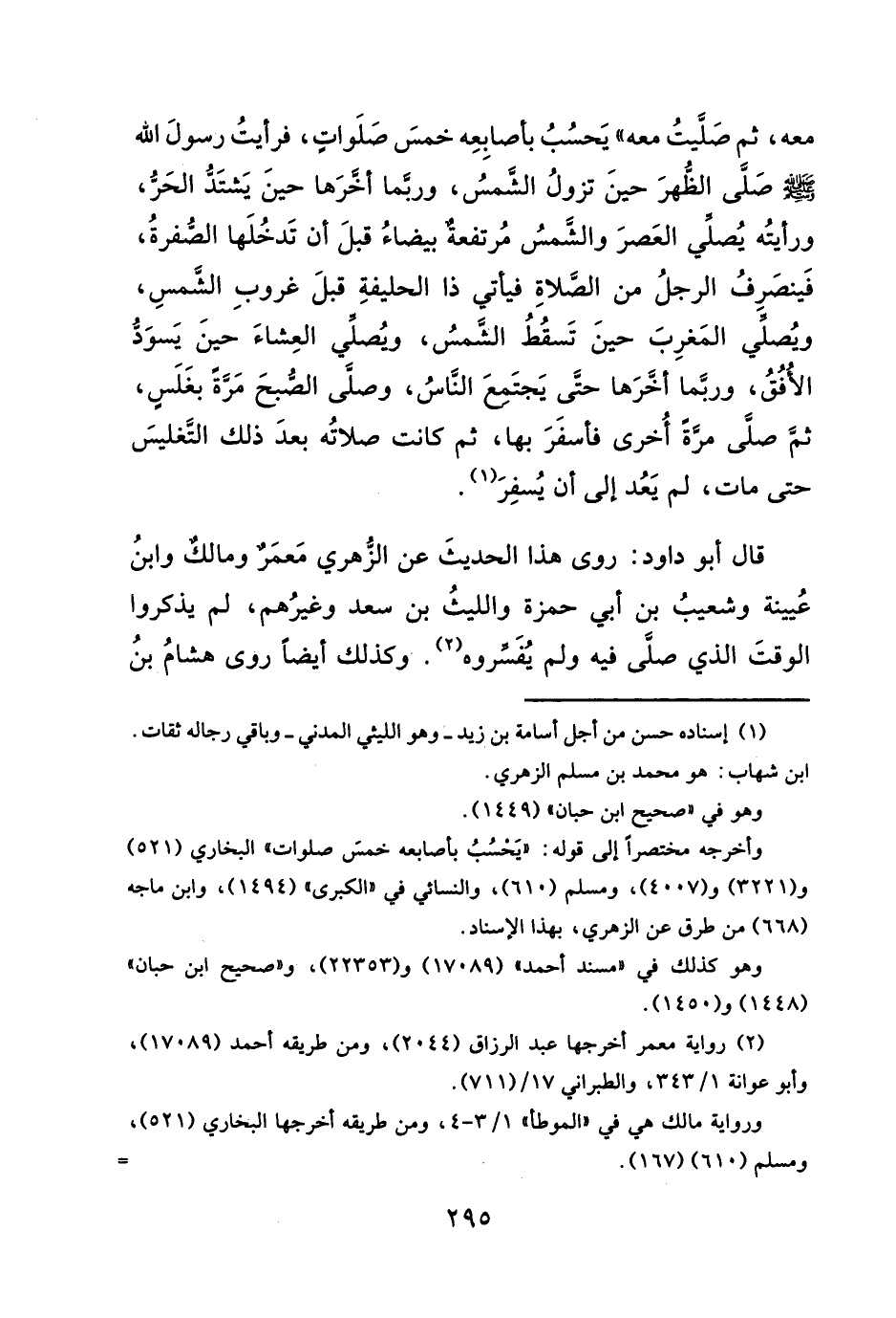 قال أبو داود: روى هذا الحديثَ عن الزُّهري مَعمَر ومالكٌ وابنُ عُيينة وشعيبُ بن أبي حمزة والليثُ بن سعد وغيرُهم، لم يذكروا الوقتَ الذي صلَّى فيه ولم يُفَسِّروه (¬٢). وكذلك أيضاً روى هشامُ بنُ