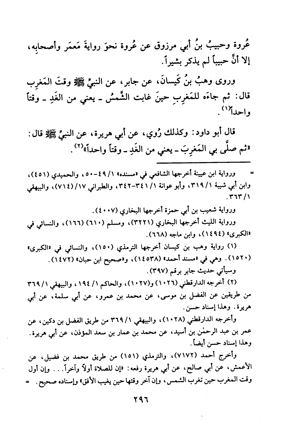 قال أبو داود: وكذلك رُوي، عن أبي هريرة، عن النبيِّ - صلى الله عليه وسلم - قال: "ثمَّ صلَّى بي المَغرِبَ -يعني من الغَدِ- وقتاً واحداً" (¬٢).