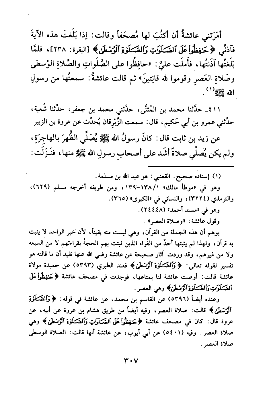 وعنده أيضاً (٥٣٩٦) عن القاسم بن محمَّد، عن عائشة في قوله: {وَالصَّلَاةِ الْوُسْطَىَ} قالت: صلاة العصر، وفيه أيضاً من طريق هشام بن عروة عن أبيه، عن عروة قال: كان في مصحف عائشة {حَافِظُوا عَلَى الصَّلَوَاتِ وَالصَّلَاةِ الْوُسْطَىَ} وهي صلاة العصر. وفيه (٥٤٠١) عن أبي أيوب، عن عائشة أنها قالت: الصلاة الوسطى صلاة العصر.