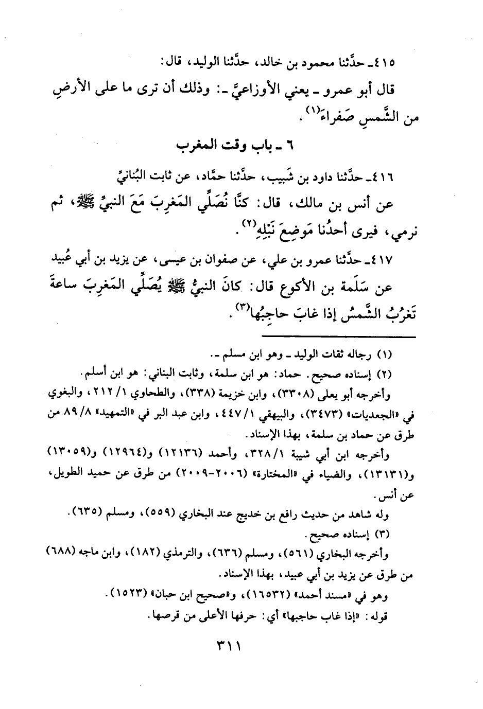 ٤١٧ - حدَّثنا عمرو بن علي، عن صفوان بن عيسى، عن يزيد بن أبي عُبيد عن سَلَمة بن الأكوع قال: كانَ النبيُّ - صلى الله عليه وسلم - يُصَلي المَغرِبَ ساعةَ تَغرُبُ الشَّمسُ إذا غابَ حاجِبُها (¬٣).