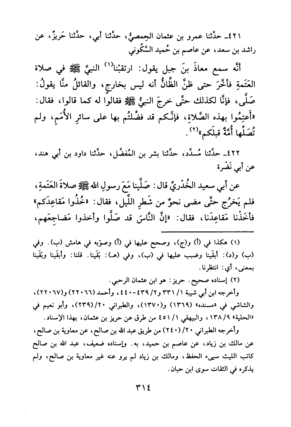 ٤٢٢ - حدَّثنا مُسدَّدٌ، حدَّثنا بشر بن المُفضَّل، حدَّثنا داود بن أبي هند، عن أبي نَضْرة عن أبي سعيد الخُدْريّ قال: صَلَّينا مَعَ رسولِ الله - صلى الله عليه وسلم - صلاةَ العَتَمةِ، فلم يَخرُج حتَّى مضى نحوٌ من شَطرِ الليل، فقال: "خُذُوا مَقاعِدَكم" فأخَذْنا مَقاعِدَنا، فقال: "إن النَّاسَ قد صَلَّوا وأخذوا مَضاجِعَهم،