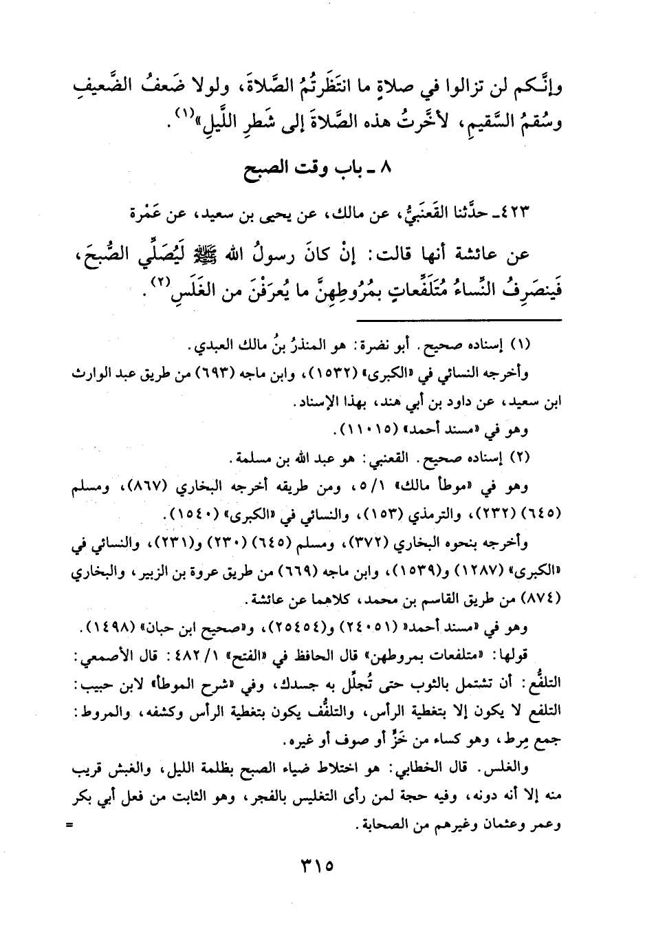 عن عائشة أنها قالت: إنْ كانَ رسولُ الله - صلى الله عليه وسلم - لَيُصَلِّي الصُّبحَ، فَينصَرِفُ النِّساءُ مُتَلَفِّعاتٍ بمُرُوطِهِنَّ ما يُعرَفْنَ من الغَلَسِ (¬٢).