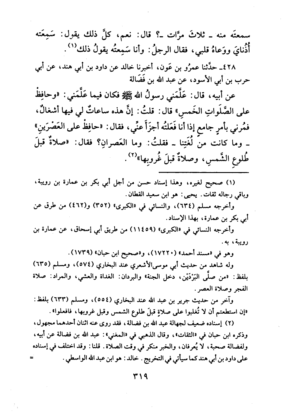 ٤٢٨ - حدَّثنا عمرُو بن عَون، أخبرنا خالد عن داود بن أبي هند، عن أبي حرب بن أبي الأسود، عن عبد الله بن فَضَالة