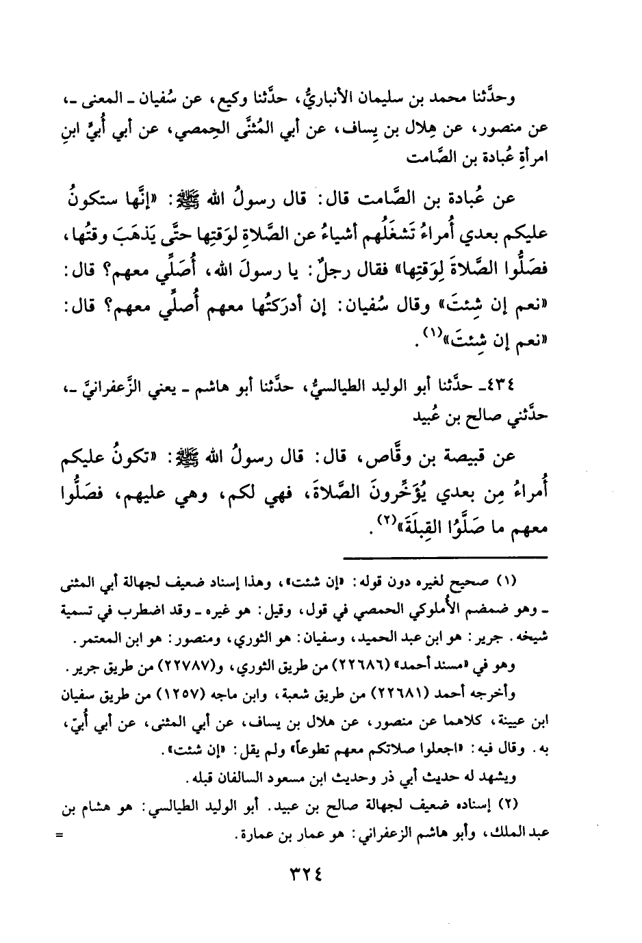عن عُبادة بن الصَّامت قال: قال رسولُ الله - صلى الله عليه وسلم -: "إنَّها ستكونُ عليكم بعدي أُمراءُ تَشغَلُهم أشياءُ عن الصلاةِ لوَقتِها حتَّى يَذهَبَ وقتُها، فصَلُّوا الصَّلاةَ لِوَقتِها" فقال رجلٌ: يا رسولَ الله، أُصَلِّي معهم؟ قال: "نعم إن شِئتَ" وقال سُفيان: إن أدرَكتُها معهم أُصلِّي معهم؟ قال: "نعم إن شِئت" (¬١).