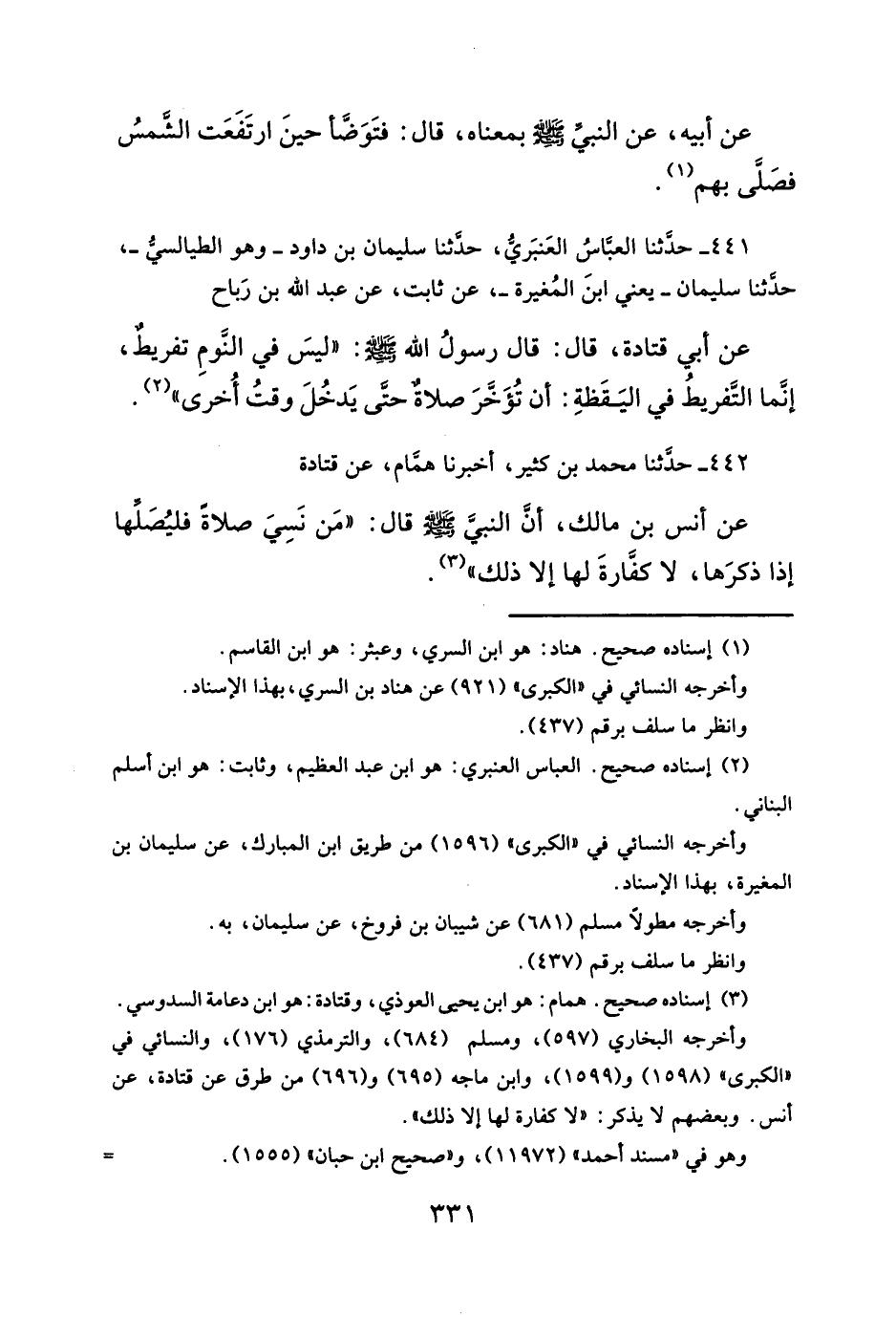 عن أنس بن مالك، أنَّ النبيَّ - صلى الله عليه وسلم - قال: "مَن نَسِيَ صلاةَ فليُصَلها إذا ذكرَها، لا كفارةَ لها إلا ذلك" (¬٣).