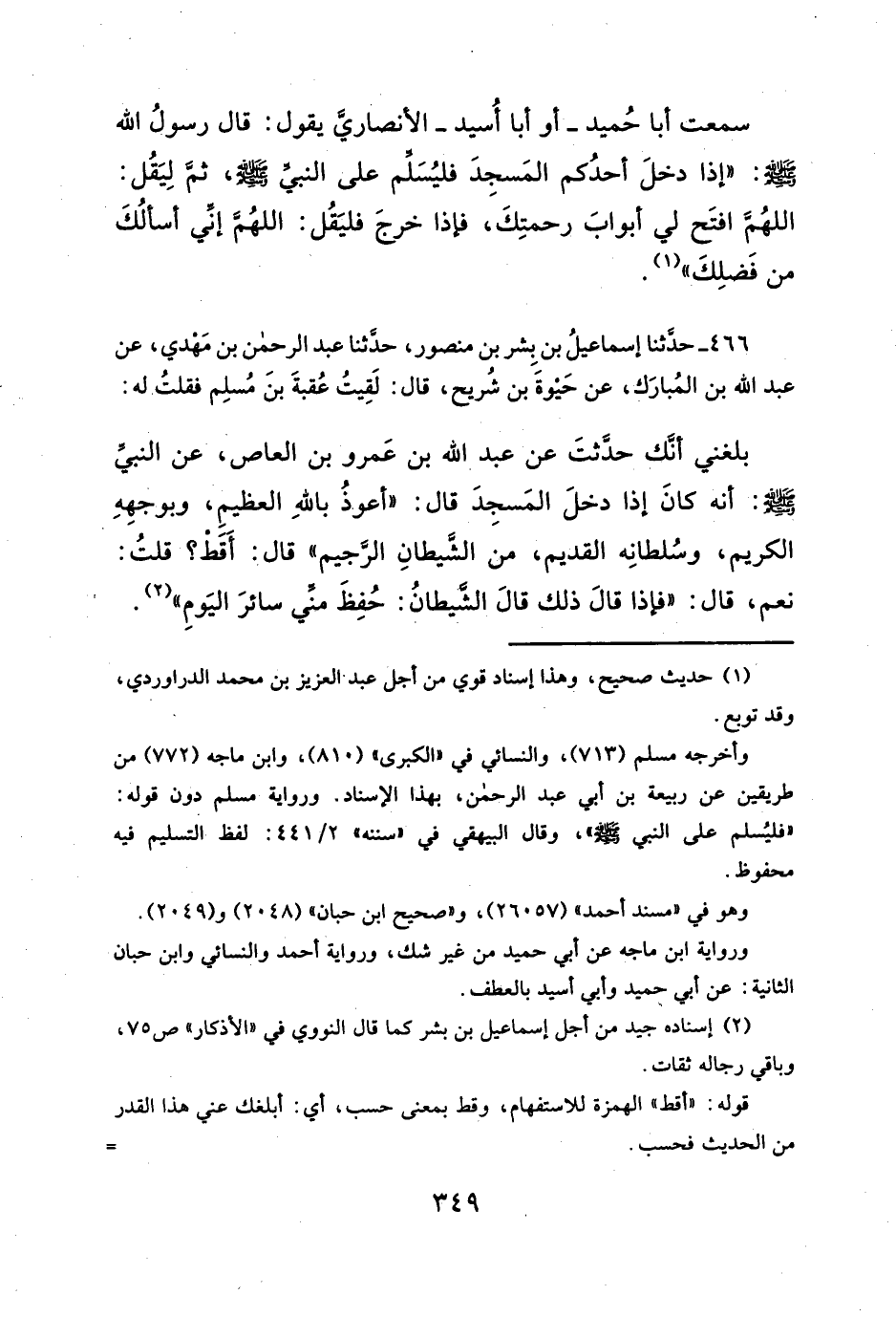 سمعت أبا حُميد -أو أبا أُسيد- الأنصاريَّ يقول: قال رسولُ الله - صلى الله عليه وسلم - إذا دخلَ أحدُكم المَسجِدَ فليُسَلم على النبيّ - صلى الله عليه وسلم -، ثمَّ لِيَقُل: اللهُمَّ افتَح لي أبوابَ رحمتِكَ، فإذا خرجَ فليَقل: اللهُمَّ إنِّي أسألُكَ من فَضلِكَ" (¬١).
