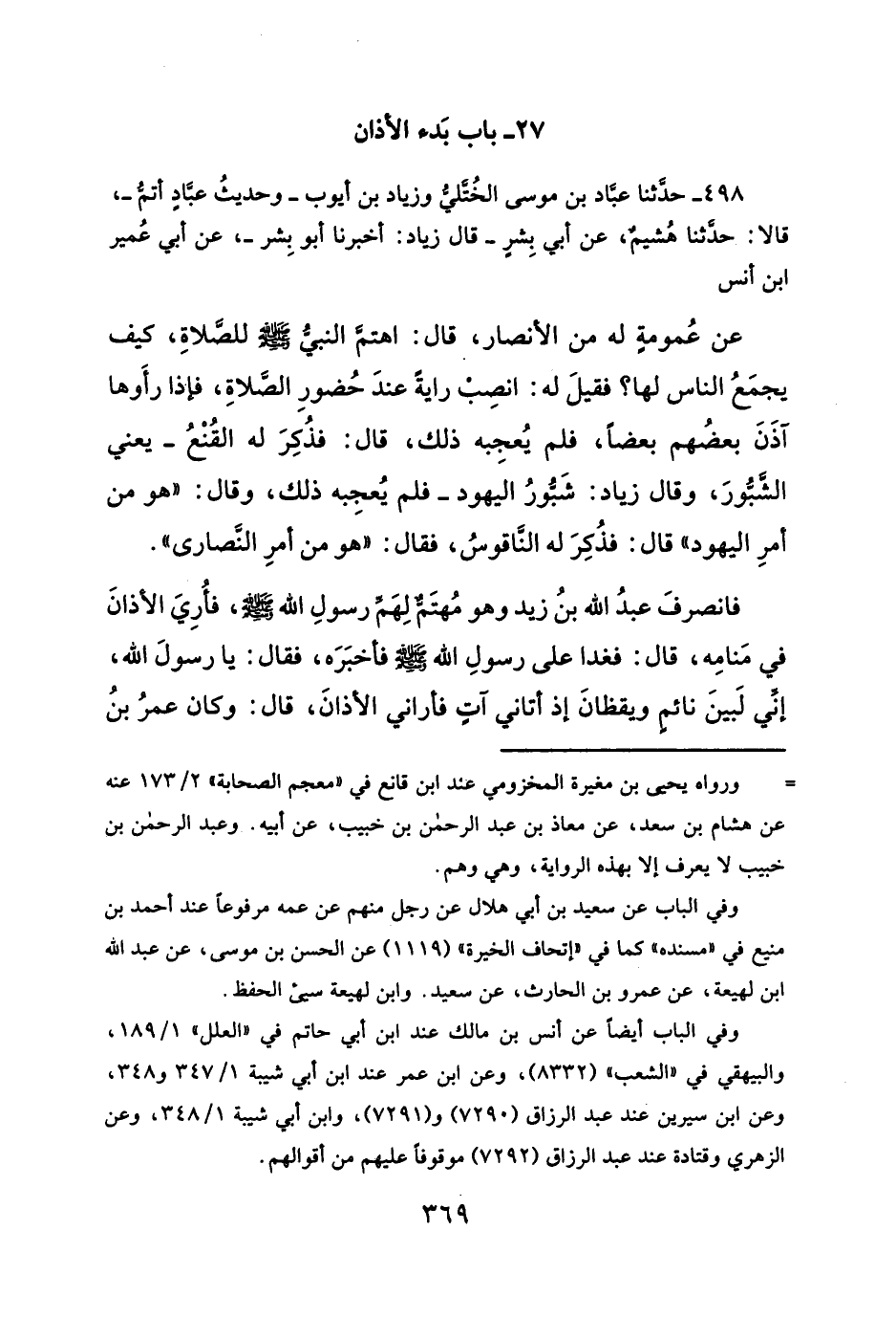 عن عُمومةٍ له من الأنصار، قال: اهتمّ النبي - صلى الله عليه وسلم - للصلاةِ، كيف يجمَعُ الناس لها؟ فقيلَ له: انصِبّ رايةً عندَ حُضورِ الصلاةِ، فإذا رأَوها آذَنَ بعضُهم بعضاً، فلم يُعجِبه ذلك، قال: فذُكِرَ له القُنْعُ -يعني الشُّبّورَ، وقال زياد: شَبّورُ اليهود -فلم يُعجِبه ذلك، وقال: "هو من أمرِ اليهود" قال: فذُكِرَ له الناقوسُ، فقال: "هو من أمرِ النّصارى".