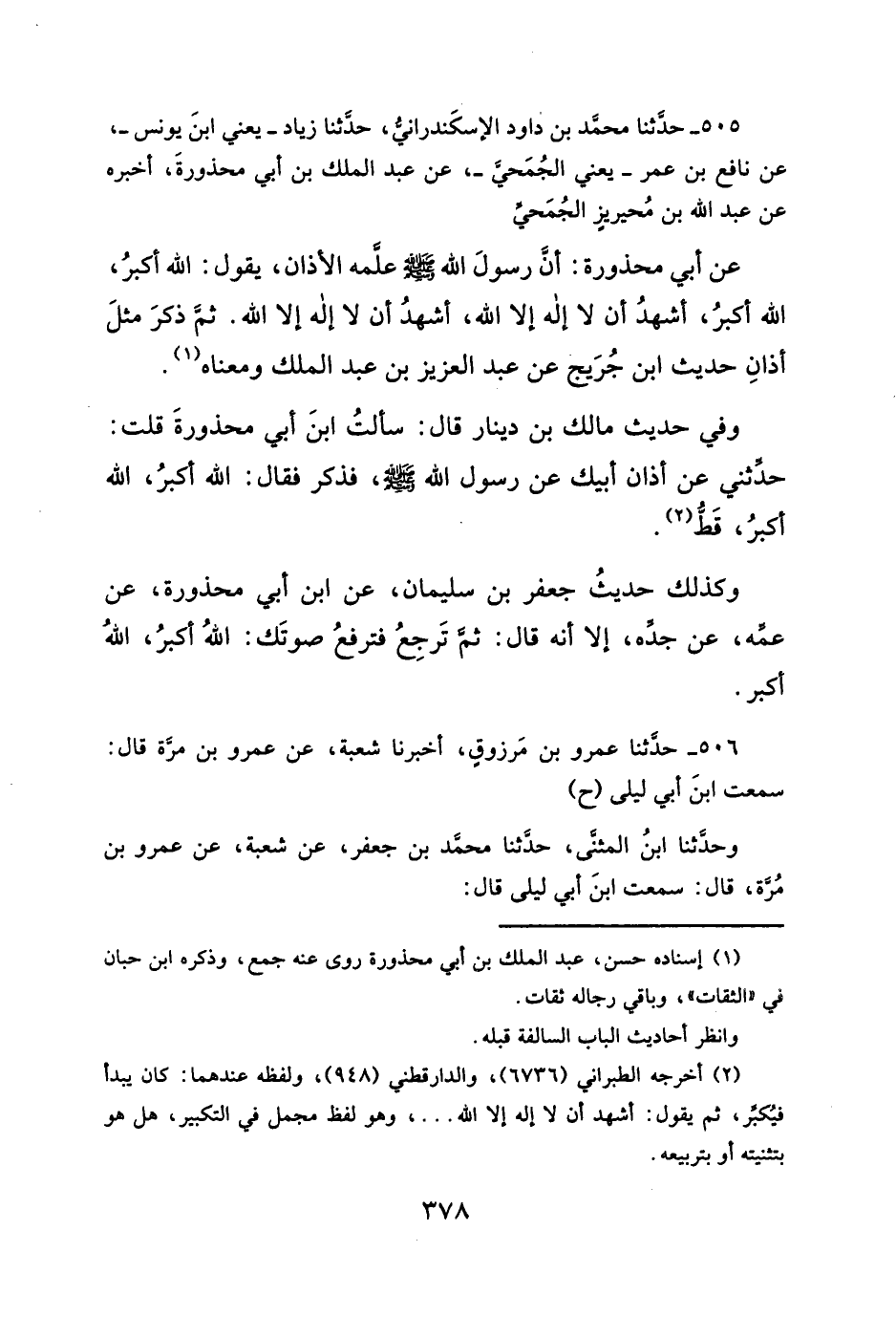 ٥٠٥ - حدَّثنا محمَّد بن داود الإسكَندرانيُّ، حدَّثنا زياد -يعني ابنَ يونس-، عن نافع بن عمر -يعني الجُمَحي-، عن عبد الملك بن أبي محذورةَ، أخبره عن عبد الله بن مُحيريزٍ الجُمَحي