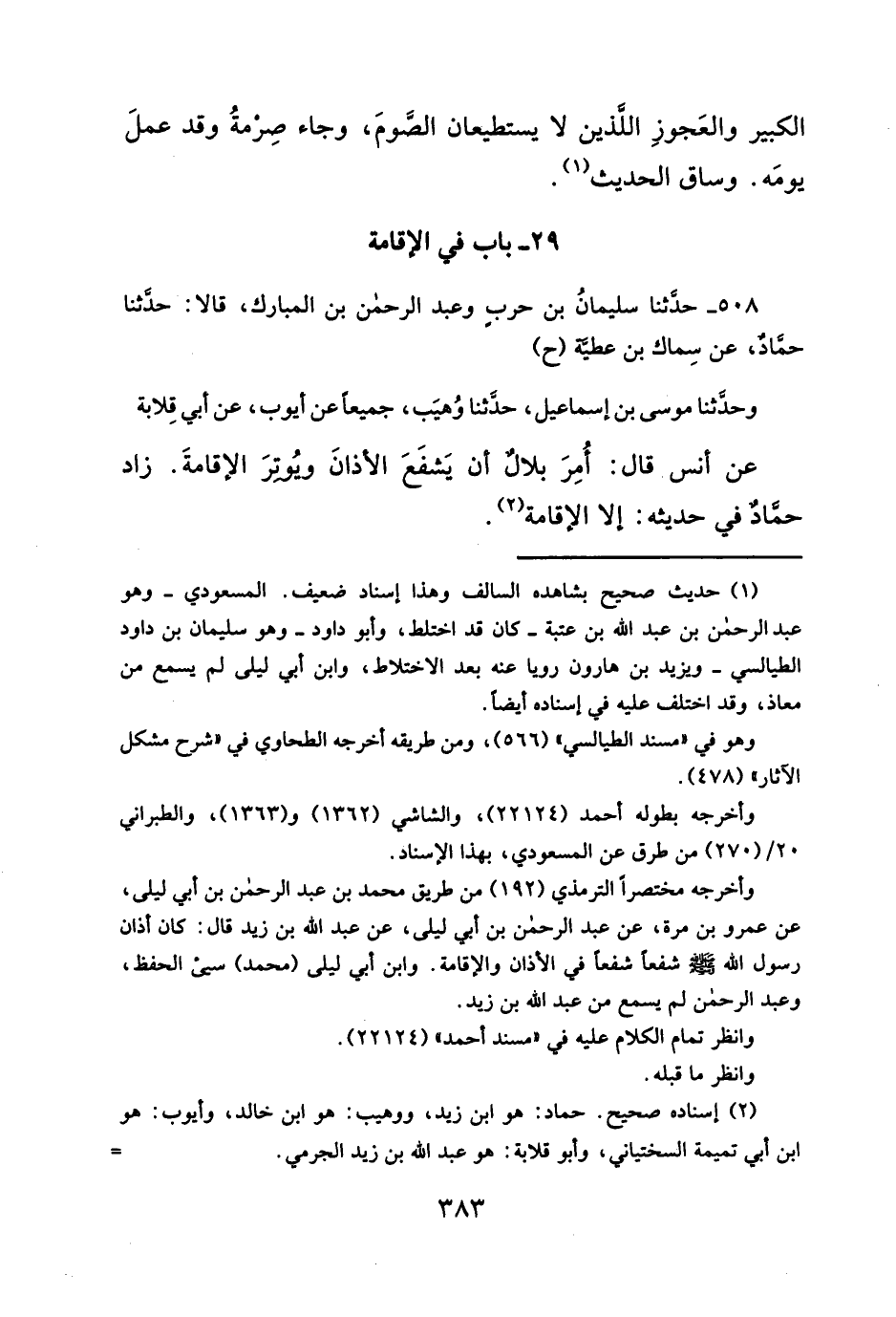 عن أنس قال: أُمِرَ بلالٌ أن يَشفَعَ الأذانَ ويُوترَ الإقامةَ. زاد حمّادٌ في حديثه: إلا الإقامة (¬٢).